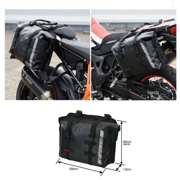 ラフ&ロード 秋冬モデル AQA DRY ソロサイドバッグ サイズ:W39×D13×H36cm(最大)カラー:ブラック【仕様説明】容量:18リットルシングルタイプでデイリーからツーリングまでカバーする頼れるサイドバッグ。サイドバッグは積載に優れたポジションでありながら地面から近いため、雨天時にはタイヤの跳ね上げる水しぶきや悪路であれば泥水を浴びる過酷な場所。しかしAQA DRY ソロサイドバッグであれば、強靭で対転倒性にも優れたターポリン生地が水は愚かホコリ、泥水からもしっかりと荷物を守り、目的地までしっかりと大切な荷物を運びます。表面の汚れ、水垢も水拭きするだけでとれるメンテナンス性も魅力です。また、車体側にはプロテクションプレートを装備し荷物と車体の干渉を和らげる配慮もしたツアラーのための新基準サイドバッグです。【機能】取付パーツ付属、防水仕様、インナーフレーム