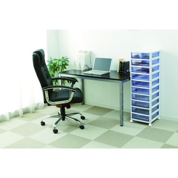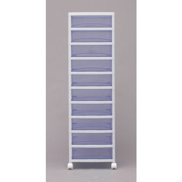 ・引き出しの材質にスチロールを採用しているため透明度が高く、中身が確認しやすいクリアタイプのチェストです。・引き出しは飛び出しにくい、簡易ロック構造です。・移動に便利なキャスター付です・事務所などでの資料の整理や保管に便利です。・引出し数:10・色:ホワイト/クリアブルー・間口(mm):320・奥行(mm):390・高さ(mm):1084・引出し色:クリアブルー・引出し内寸(mm)間口:260・引出し内寸(mm)奥行:360・引出し内寸(mm)高さ:77・引出し耐荷重(kg):2・キャスター:あり・完成品(キャスター・ゴム足は別途取付)・キャスター・ゴム足付・ポリプロピレン(PP)・スチロール・引き出しが1つのものはキャスターは付いていません。・生産国 日本・JANコード 4905009996964・質量 6.550kg・コード:494-3694 ・品目:SCE1000BL