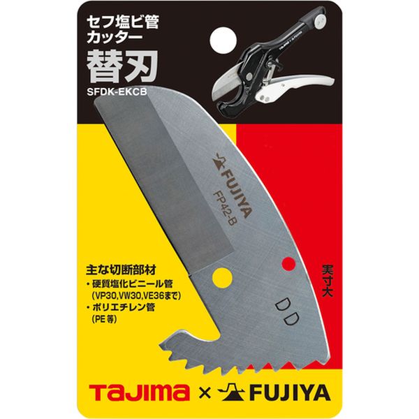 ・セフ塩ビ管カッター(SFDK-EKC)用替刃です。・硬質塩化ビニール管の切断用。・全長(mm):86・色:シルバー・刃厚(mm):1.6・刃長(mm):86・適合本体:SFDK-EKC・箱入数(枚):10・パック入数(枚):1・対象被削材:VP30、VW30、VE36まで・必ず適合した機種でご使用ください。・製品仕様は予告なく変更する場合がございます。・予めご了承ください。・生産国 中国・JANコード 4975364269331・質量 56g・コード:693-9765 ・品目:SFDKEKCB