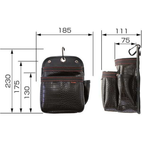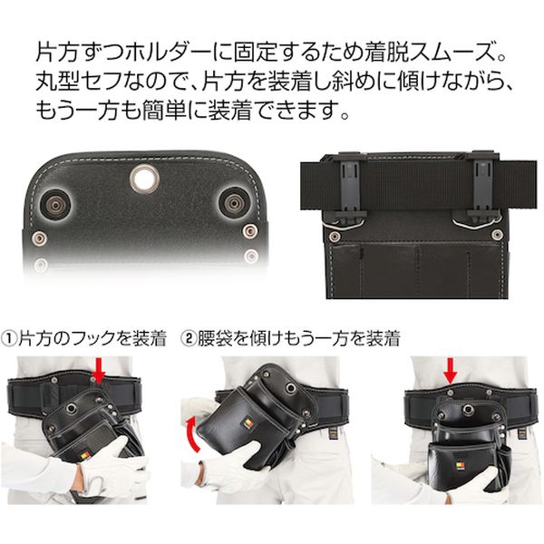 ・※セフホルダーは別売となります。・ご利用にはセフホルダーが必要になります。・2つのセフで着脱性アップした「セフツインフック」です。・高強度でしなやかな高耐久合成皮革です。・光沢と凹凸が独特の高級感と存在感を放つクロコ調です。・幅広い職人さんに適したスタンダード形状の腰袋です。・セフ取付収納物総重量:3.0kg以下です。・ちょい使いができるフック掛けホールとカラビナ付です。・腰周りの組み換えが簡単です。・ベルトに後から装着可能なセフ着脱式です。・工具収納用。・色:茶・形状:スタンダード・幅(mm):185・奥行(mm):111・高さ(mm):230・ベルト通し幅(mm):50・製品重量(g):250・包装形式:台紙・包装寸法タテ(mm):253・包装寸法ヨコ(mm):158・包装寸法オクユキ(mm):114・梱包単位:24個(4個入×6)・セフ取付収納物総重量:3.0kg以下・セフ:別売・生地:合皮・パーツ:ナイロン・カラビナ・必ず許容総重量以内でご使用ください。・取扱い説明書をよく読んでからご使用ください。・製品仕様は予告なく変更する場合がございます。・予めご了承ください。・生産国 台湾・JANコード 4975364267764・質量 250g・コード:524-3849 ・品目:SFKBG2S2H