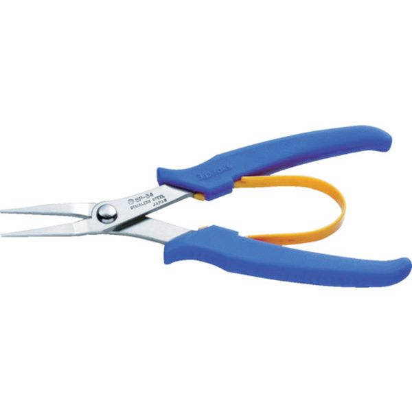 ・「つかむ、つまむ、ひっぱる、さしこむ」に適した先細リードペンチです。・手になじむエラストマー樹脂グリップです。・全長(mm):152・落下防止用ひも取付穴:無・プラスチック製ばね付・先端部ギザなし・ステンレス(SUS420J2)・グリップ:エラストマー樹脂・生産国 日本・JANコード 4960225290159・質量 55g・コード:381-9469 ・品目:SP34