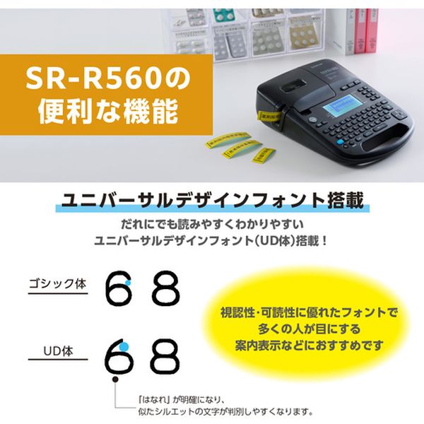 ・「テプラ」PROシリーズで初めて本体にリサイクル素材(再生プラスチック)を使用しました。・視認性の高いユニバーサルデザインフォント「UD体」を搭載し、より多くの人に読みやすく分かりやすいラベルを作成できるのも特長です。・そのほか建築土木や医療健康用語辞書を搭載し、専門用語も一度の変換でスムーズに入力できます。・印字密度(dpi):180・幅(mm):184・奥行(mm):238・高さ(mm):79・適合テープ幅(mm):4~24・電源:ACアダプタ、単3電池・本体色:ブラック・外形寸法(mm):約184(W)×238(D)×79(H)・質量:約755g(電池、テープ除く)・プリンタ:サーマルヘッド(180dpi/128dot)、熱転写PRO方式・最大印刷可能幅(mm):18.1・テープカートリッジ(mm):PROテープカートリッジ4、6、9、12、18、24・カッター:オートカッター・対応PCラベルソフト:「テプラ・クリエイター」(SPC10)・主な材質:再生ABS・セット内容:本体、ACアダプタ(AC1116J)、USBケーブル、基本操作マニュアル(保証書付)・精密機械ですので取扱いにご注意ください。・直接日光の当たる場所や、高温・多湿の場所での使用または保管はしないでください。・本製品に登録したデータは、長期的・永続的に保存することは出来ません。・本製品の故障、検査、電池消耗などに起因するデータの損失および逸失利益につきましては一切その責任を負いかねますのであらかじめご了承ください。・本製品は日本国内専用です。・生産国 中国・JANコード 4971660783069・質量 755g・コード:699-6862 ・品目:SRR560