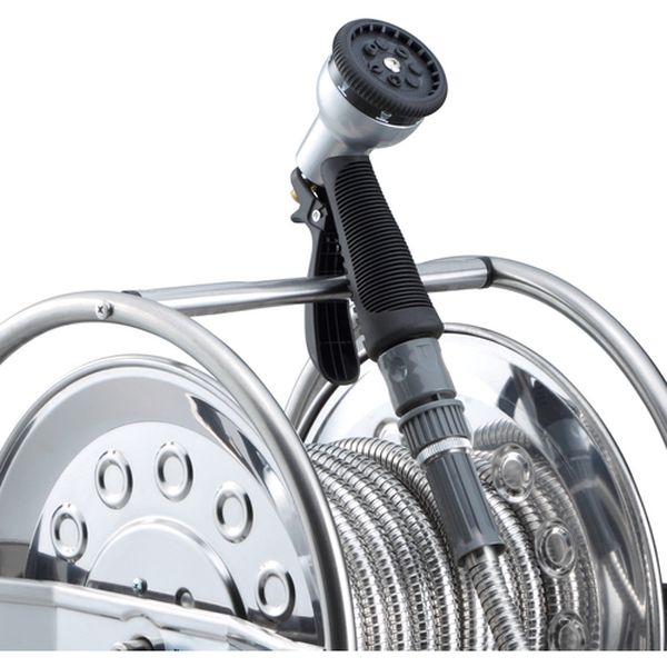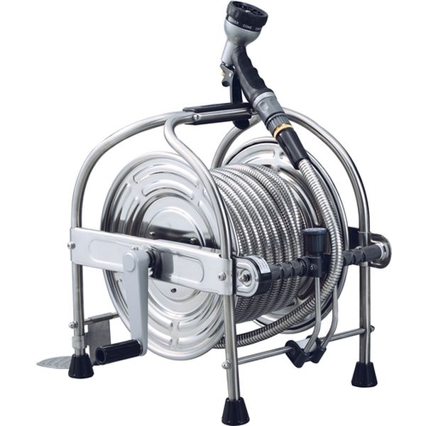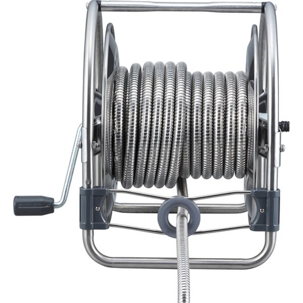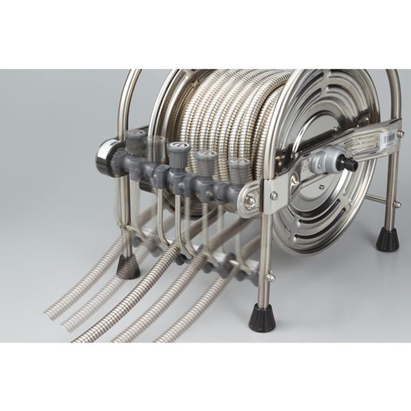 ・穴あきがない優れた耐久性です。・全長がステンレスで覆われ、内部ホースを保護しています。・折れ・潰れによる水量変化がありません。・出っ張りや障害物もスルリとかわします。・オールステンレスで錆びにくくベタつきません。・オールステンレスならではの清潔感があります。・ねじりグセがない、滑らかな巻取り引き出しが可能です。 錆びにくいステンレス蛇腹ホースを採用し、流量20%アップの大口径タイプです。・ホースに手を触れることなくラクラク整列巻きが可能です。シンプルなベルト駆動方式で故障がなく、ホースを引き出す時は ノブを持ち上げて回せばフリー状態になりホースのからみがありません。・使用後は、本体持ち手部にレバーノズルが引っ掛けられます。・水の出方を用途に合わせた7パターンから選んで使えます。・庭の散水用に・食品工場や給食施設、水産物を扱う場所等での床清掃に・ホース全長(m):15・適合ホース内径(mm):12.0・適合ホース外径(mm):18.0・使用圧力(MPa):0.4・幅(mm):368・奥行(mm):413・高さ(mm):405・本体色:シルバー・ホース色:シルバー・蛇口側ホース長さ(m):1・防藻ホース1m付・オールステンレス仕様・LN-3型レバーノズル標準装備・使用後はホースを巻き取った後、水道蛇口栓で止水を行い、ホース内の水抜きをすること。特に冬期は凍結破損防止のため十分に行うこと。・飲料及び食品加工等の用途には使用しない。・蛇腹ホースの上を車で通過したり重量物を載せない。ホースが潰れて変形すると、元の形状に戻すことができません。・生産国 日本・JANコード 4930510419763・質量 7.200kg・コード:660-6969 ・品目:SSA15J