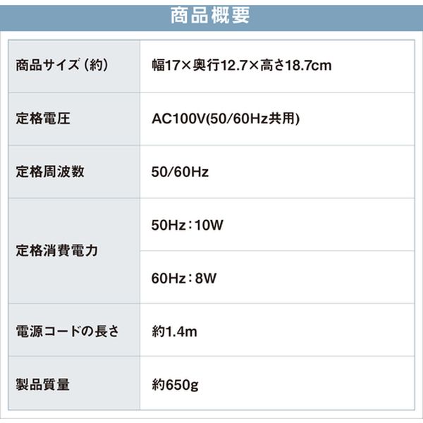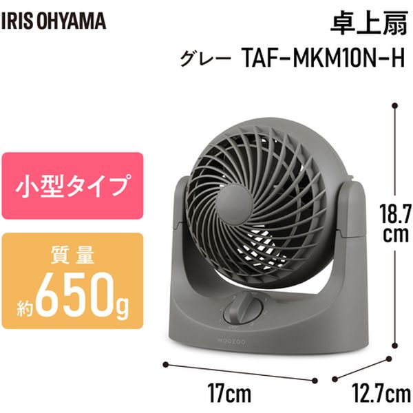 ・マカロンのようにころんとしたフォルムで、卓上タイプの扇風機です。・既存のマカロン型サーキュレーター(比較:PCF-MKM15)の約2/3のコンパクトサイズで、デスクやテーブルの上に置いても邪魔になりません。・手動で上下方向の角度調整ができます。・前面ガードを取り外せるので、本体内側のお手入れができます(ねじ4か所あり)。・暑さ対策に。・電源(V):単相100・消費電力(W)(50/60Hz):10/8・ハネ径(cm):10・幅(mm):170・奥行(mm):127・高さ(mm):187・電源コード長さ(m):約1.4・風量調節:3段階・設置タイプ:卓上・標準消費電力料金(50Hz):0.3円/h・標準消費電力料金(60Hz):0.2円/h・色:グレー・角度調整(手動):上下6段階 (下約22.5°~上約90°まで)・ABS、PP等・生産国 中国・JANコード 4967576739900・質量 650g・コード:699-3502 ・品目:TAFMKM10NH