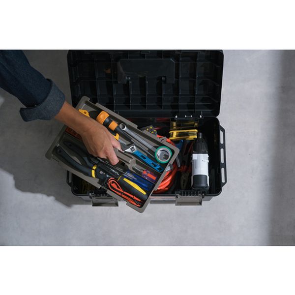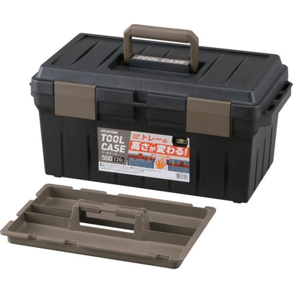 ・使い勝手の良いツールケースです。・ハンドツール・パーツの収納に適しています。・持ち運ぶことが出来るインナートレーが付いています。・また、トレーは可動式で片側に寄せれば背の高いアイテムも収納可能です。・トレーの高さ調節機能により収納汎用性がアップしました。・インナートレーの向きを変えるだけで高さを変えることができるので、作業後に缶やハンマーなど大きな工具を収納する際も、スムーズに収納することができます。・工具収納に。・色:ブラック/サンドベージュ・外形寸法(mm)間口:490・外形寸法(mm)奥行:255・外形寸法(mm)高さ:240・有効内寸(mm)間口:405・有効内寸(mm)奥行:200・有効内寸(mm)高さ:175・耐荷重(kg):約20・中皿:有・フタ・本体・トレー・ハンドル:ポリプロプレン(PP)・バックル:ABS樹脂・インナートレー・生産国 中国・JANコード 4967576733168・質量 1340g・コード:705-3839 ・品目:TCR500