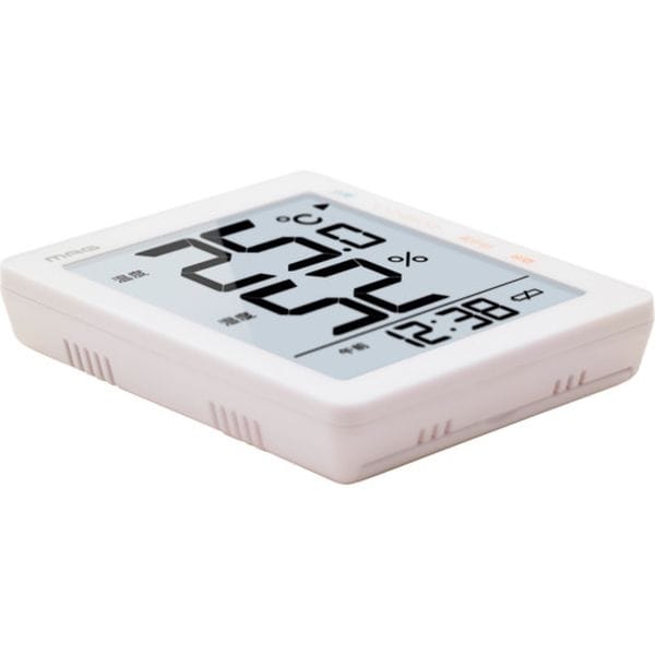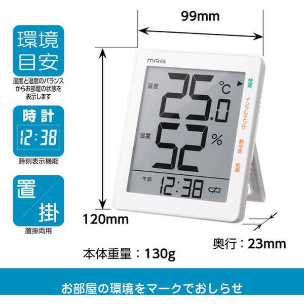 ・時計表示もついた見やすいサイズの温湿度計です。・部屋の環境状態を4種類の注意マークでお知らせ・測定温度範囲(℃):-9.9~+50・温度最小表示(℃):-9.9・測定湿度範囲(%RH):10~95・湿度最小表示(%RH):10%RH・幅(mm):99・奥行(mm):23・高さ(mm):120・色:ホワイト・温度表示(-9.9~+50℃)、湿度表示(10~95%RH)、時刻表示、12/24時間表示切替、環境目安表示(快適/インフルエンザ/熱中症/乾燥)、最高最低温度湿度表示、電池交換お知らせ表示、置掛両用・電源:単4乾電池×2本(付属)・プラスチック、ガラス・取扱説明書、保証書・生産国 中国・JANコード 4952324010516・質量 130g・コード:659-0991 ・品目:TH105WH