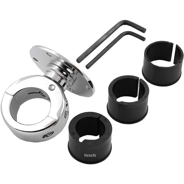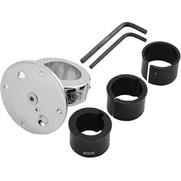 ハンドルバークランプマウント ベーシックハンドル対応サイズ:7/8(22mm)、1(25mm)、1-1/8(28mm)、1-1/4(32mm)トッププレート:直径59.5mmセンターでの固定か18mmオフセット可能GarminZumo550固定対応の4ホール+6mm穴設定クロームコンパクトにハンドルバーへマウントトッププレートはラウンドタイプの採用で無段階調整が可能(360度回転)