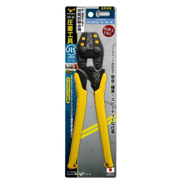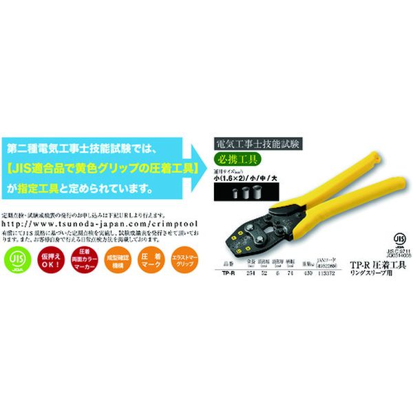 ・電気工事技能試験必携工具です。・作業効率アップの両面カラーマーカー仕様です。・仮押え可能で、電線の差し込みがスムーズに行えます。・JIS C9711認証取得品です。・成形確認機構内蔵で圧着マークがくっきりするため、ミス防止になります。・リングスリーブの圧着に。・全長(mm):254・圧着端子([[MM2]])リングスリーブ用:小(1.6×2)、小、中、大・本体:機械構造用炭素鋼・グリップ:エラストマー樹脂・頭部:クロムモリブデン鋼・非絶縁工具です。電源を切ってお使い下さい。・使用用途以外には使用しないで下さい。・その他商品台紙注意事項参照。・生産国 日本・JANコード 4952269113372・質量 430g・コード:785-2983 ・品目:TPR