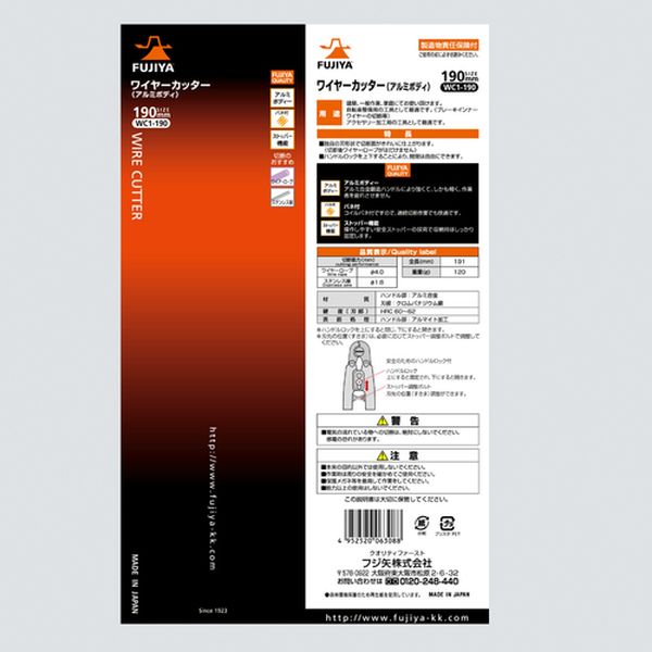 ・建築作業時のワイヤーカットや自転車のアウターケーブル、インナーケーブルの切断に最適です。・刃先の隙間は必要に応じてストッパー調整ボルトで調節が可能です。・安全のためのハンドルロック付です。・アルミ製ハンドルを使用した軽量タイプです。・作業性の良いバネ付タイプです。・ハンドル本体にアルミ合金を使用した超軽量のカッターです。・ワイヤーの切断面がきれいに仕上がります。・ワイヤーロープの切断に。・切断能力(mm)ワイヤ:φ4・全長(mm):191・切断能力(mm)ステンレス線:φ1.8・ステンレス線:φ1.8・ハンドル部:アルミ合金・刃部:特殊鋼・生産国 日本・JANコード 4952520063088・質量 120g・コード:453-8358 ・品目:WC1190