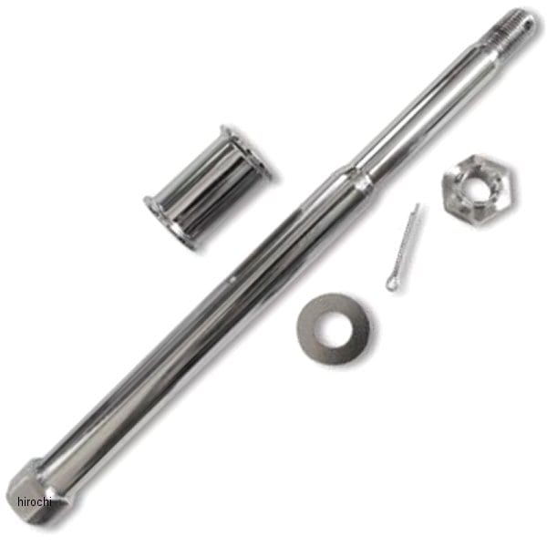 ガッツクローム フロントアクスルシャフト36年-48年 BTW&W製アクスルシャフト首下長:24.5cm径(太)17.4mm、(細)14.2mmネジ部:1/2-20カラー長:42mm社外のテーパーベアリング仕様のスターハブに使えるアクスルシャフトキットです。アクスルナット、ワッシャ、カラーが付属します。補修、カスタムにお使い下さい。