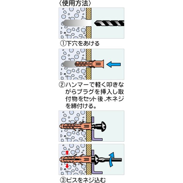 ・安定感抜群です。・プラグの羽根がしっかり食い込みます。・ALC、コンクリート、タイル、レンガなどへの取り付けに。・呼び径(mm):7・長さ(mm):35・穿孔深さ(mm):35・引張最大荷重(kN)コンクリート:4.83・引張最大荷重(kN)ALC:1.17・下穴径(mm):7・下穴径(mm)コンクリート:7・下穴径(mm)ALC:7・使用ビス径(mm):4.1~5.1・色:グリーン・ナイロン・生産国 日本・JANコード 4992456030631・質量 110g・コード:115-1150 ・品目:Z735