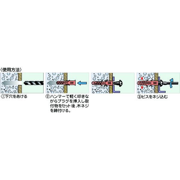 ・安定感抜群です。・プラグの羽根がしっかりくい込みます。・ALC、コンクリート、タイル、レンガなどへの取り付けに。・呼び径(mm):5・長さ(mm):25・穿孔深さ(mm):25・引張最大荷重(kN)コンクリート:2.50・引張最大荷重(kN)ALC:0.75・下穴径(mm):5・下穴径(mm)コンクリート:5・下穴径(mm)ALC:5・使用ビス径(mm):2.7~3.1・色:レッド・ナイロン・生産国 日本・JANコード 4992456030891・質量 95g・コード:115-1154 ・品目:ZC525