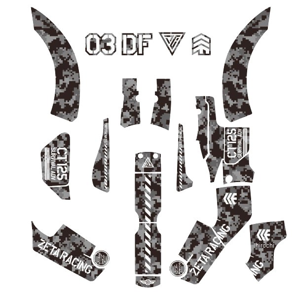 ジータ ZETA グラフィックキット ホンダ CT125 ブラックカモ20-22/23-25 ホンダ CT125カラー:ブラックカモ内容:グラフィックデカール 1台分(計21pcs)貼り付けるだけで簡単にイメージチェンジDFコンセプトマシンCT125 SURVIVAL ADV2のためにデザインされたグラフィックキット。デカールを貼り付けるだけで、簡単にアーミーテイストにイメージチェンジできる。プロテクション効果も高く、傷から外装を守る。伸縮性の高い素材を採用し、車種専用にカットされているため、きれいに貼りやすい。※貼る際に、ドライヤーを使用しないでください。※イメージ画像には、商品には付属していないデカールがございます。(エンブレム、ハンドガードなど)※商品写真には他車種、他カラーを含む場合がございます。
