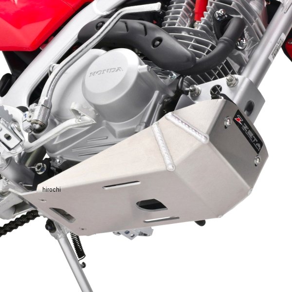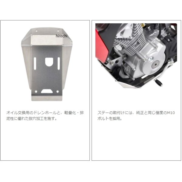 EDスキッドプレート14年以降 ホンダ CRF125F【素材】本体:アルミ合金ステー・取付ボルト:スチールワッシャー:ステンレススペーサー:アルミ【仕様説明】CRF125F専用スキッドプレート。エンジン下部を飛び石等から守り、破損によるトラブルを防ぐ。本体は4mm厚のアルミ合金、取付けには5mm厚のスチール製のステーを採用し、岩や丸太等に乗り上げても耐えうる。エンジンに直接ではなく、ステーによる取付けでエンジンの破損を防ぐ。さらに、このステーがアンダーフレームの役割を果たし、取付強度に優れる。オイル交換用のドレンホールと、軽量化・排泥性に優れた抜穴加工を施す。ステーの取付けには、純正と同じ強度のM10ボルトを採用。