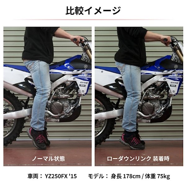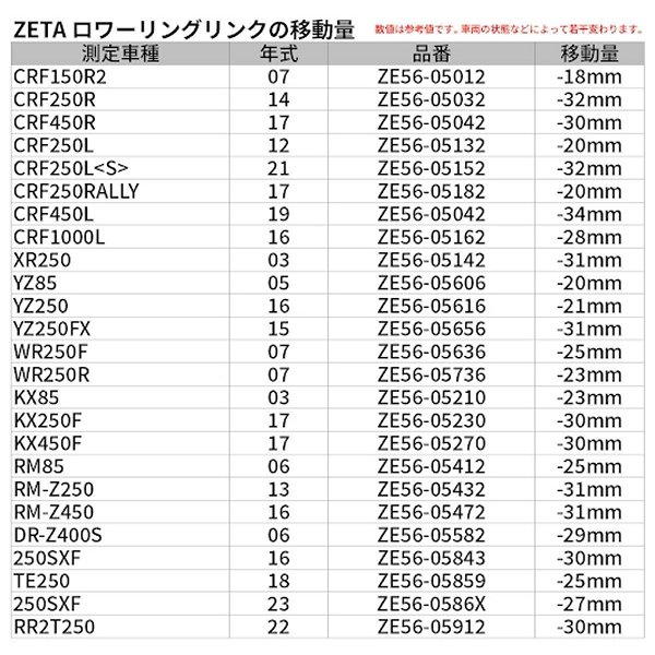 ジータ ZETA ロワーリングBETA RRBETA RSBETA XTRAINERカラー:レッド30mmダウン足付き性が向上するリヤローダウンリンクロッド。車種専用で純正のリンクロッドと交換するだけのボルトオン設計。材質に7000系アルミ合金を使用し、高精度切削加工を施す。ブルーアルマイト処理、レーザープリントロゴ仕上げ。ベアリング圧入済み。※KX85はベアリング、シールはプレートタイプの為付属しません。※リンク比が変わるため、サスペンションが柔らかくなります。【備考】YZ250FX '15-16 / WR250F '15-16YZ250F '14-16 / YZ450F '10-16ダウン量:28mmCRF250L/Mダウン量:20mmWR250R/Xダウン量:23mm