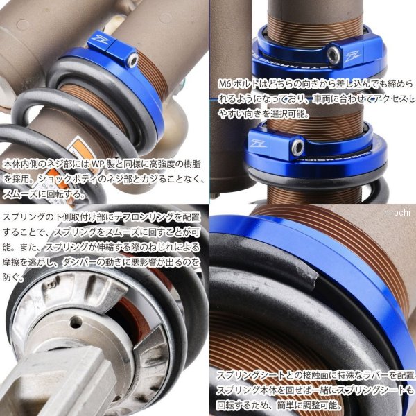 ジータ ZETA リヤショック プリロードアジャスター KYB50カラー:ブルー【素材】本体:高強度アルミ合金本体ネジ部:樹脂製6ボルト:アルミテフロンリング:テフロン【仕様説明】純正のロックナットとスプリングシートを交換するだけで、大変だったスプリングのプリロード調整を容易にする。ロックナット方式ではなく、WP等でも用いられているバンド方式を採用。5mmの六角レンチでロック・解除が可能。プリロード調整をする際に何度も叩き込む必要はなく、車体に付いた状態でもスプリング本体を手で回すだけで簡単に調整可能。※一部サスペンションは分解しないと取付けられない場合があります。※一部のショックボディ本体のネジ長が短いリヤショックは、プリロード調整幅が制限される場合があります。