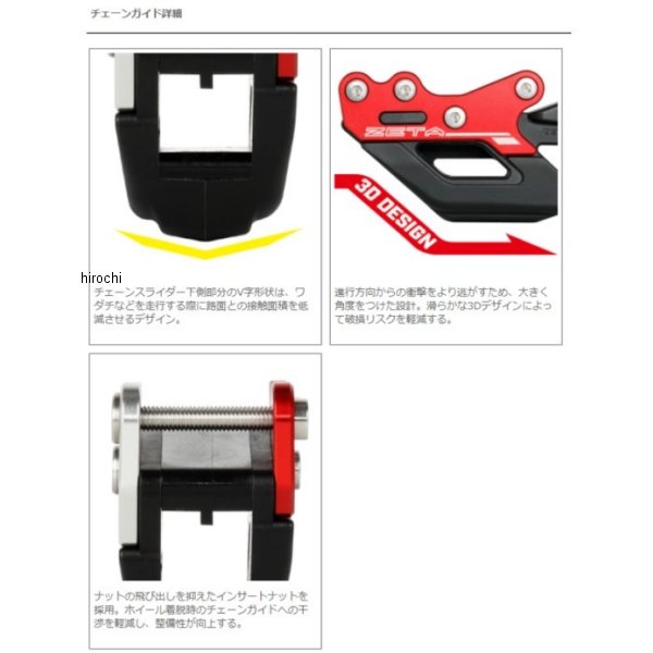 ジータ チェーンガイドカラー:ブラック【仕様説明】・耐摩耗性、復元性に優れるPU樹脂製スライダーとジュラルミンプレートで構成されたチェーンガイド。・衝撃を受けやすく、トラブルになりやすい箇所にはPU樹脂を採用し、スイングアーム取付ステーへの負荷を緩和。・3Dデザインによるスライダーはあらゆる方向の衝撃を逃がす。・車種専用にデザインされたジュラルミンプレートにより剛性が必要なガイド性能を確保。・取付けは取り外し可能な低~中強度のネジロック剤を塗布してください。・定期的にスライダーの摩耗を点検してください。・トレール車に装着する場合は、レーサーと同等にガイド性能を高めて設計しているため丁数によって摩耗の速度が異なります。(最大丁数 48丁まで)
