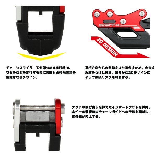 ジータ ZETA チェーンガイド14年以降 KTM SX、SXF、XC、XCF、EXC、EXCFカラー:レッド※純正チェーンガイドの上に重ねて装着してください。トレールモデルのチェーンガイドの上にボルトオンで装着し、転倒やガレ場の岩などからガード。ホンダ車用は前方へ取付位置調整を可能とし、最大で46Tスプロケットまで対応。アルミ合金をCNC加工、チタンアルマイト処理を施す高品質仕上げ。
