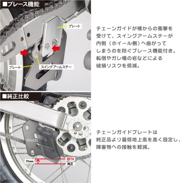 ジータ デュラブル チェーンガイドヤマハ SEROW250【仕様説明】チェーンガイドプレート:A7009 削り出しチェーンガイドブロック:POM製リヤスプロケット対応 最大丁数:50丁・チェーン脱落防止ガイドブロックを装備した6mm厚 高強度アルミ合金製チェーンガイド。・横方向からの衝撃を受けて、スイングアームステーが内側へ曲がるのを防ぐブレース機能付き。・消耗した際に取り換え可能なリプレースメント チェーンガイドブロックもラインナップ。・チェーンガイドが横からの衝撃を受けて、スイングアームステーが内側 (ホイール側)へ曲がってしまうのを防ぐブレース機能付き。・転倒やガレ場の岩などによる破損リスクを低減。・チェーンガイドプレートは純正品より最低地上高を高く設定し、障害物への接触を軽減。・チェーンの脱落防止とバタつきを抑制するガイドブロックを装備。・摩擦抵抗の少ないPOM製でパワーロスを最小限に抑える。・スプロケット丁数やチェーンの遊び量に合わせて上下に位置調整が可能。・簡単に着脱可能なチェーンガイドブロックを取り外すことで、チェーンのバタつきが少ないストリートユースにも対応。