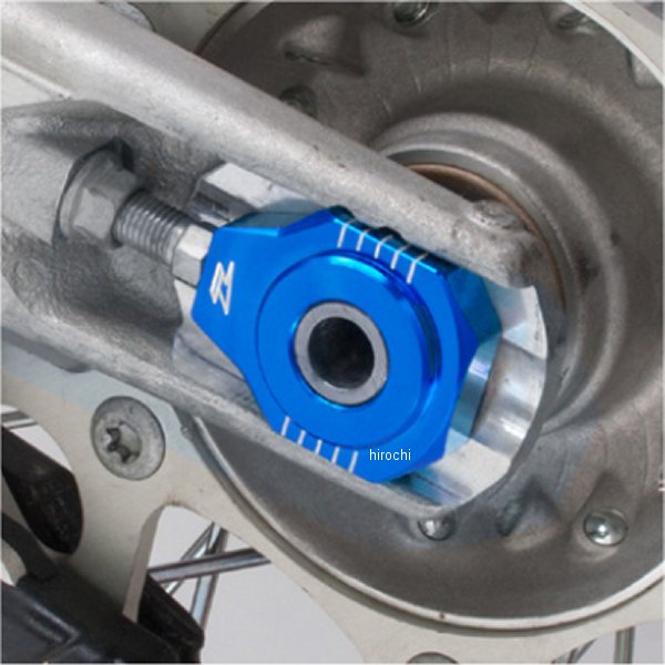 ジータ ZETA リヤアクスルブロック12年 KTM SX、SXFカラー:ハスクブルー外形から目盛りに至るまですべてにCNC加工を施す。のぞき込む必要がなく作業性の向上と正確な調整が可能なサイド目盛り。ホイールベースを長くとるライダーの間で多発するアジャストボルトの破損を回避する前後オフセットデザイン