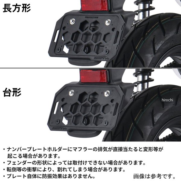 ジータ ZETA プロテクションナンバープレート ホルダー 126cc-素材:強化樹脂表面処理:サンドブラスト仕上げ【仕様説明】ハニカム構造と軽量素材で軽さと強さを両立。振動や衝撃によるナンバープレートの変形やひび割れを防ぐナンバープレートホルダー。素材に強化樹脂を採用し、高い強度と軽量化を両立。サンドブラスト仕上げにより車両のリヤビューを引き締め、ドレスアップ効果にも最適。【注意事項】・ナンバープレートホルダーにマフラーの排気が直接当たると変形等が起こる場合があります。・フェンダーの形状によっては取付けできない場合があります。・転倒等の衝撃により、割れてしまう場合があります。・プレート自体に防振効果はありません。・125cc以下用を取付けの際は必ずナンバープレートの形状を確認してください。