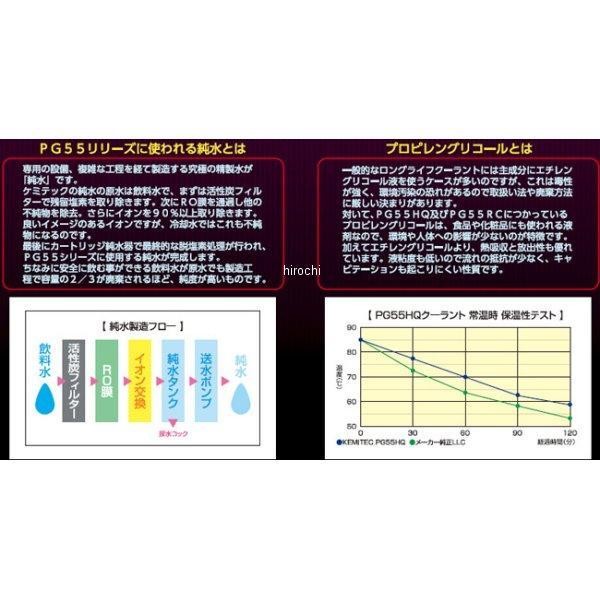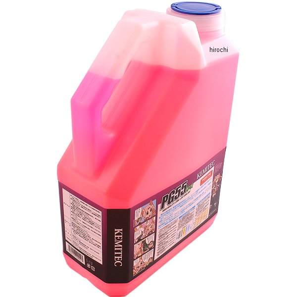 KEMITEC PG55HQ 高品質ロングライフクーラントです。容量:2.2Lカラー:ピンク バイクの環境性能を向上させる冷却水。暖気の即湿性&保温と5年/5万kmの長寿命。環境負担が少ない、プロピレングリコール使用の高品質LLCプロピレングリコール+純水+添加剤M.A.IリキッドPG55HQは高性能な純水とプロピレングリコール50%が主成分で、さらに長寿命を実現する独自開発の添加剤 M.A.I リキッド を加えた高品質ロングライフクーラントです。エンジンの冷間時始動から適正水温まで上昇する時間が短いので、暖気時間が短縮されます。保温性もよいので、アイドリングストップ機能付きのバイクではエンジン停止時の適正水温域を保ちます。凍結温度は-30度なので、極寒地域での使用に対応します。液体粘度が低い為ウォーターポンプ等の駆動抵抗が少なくエンジンの負担を軽減消泡作用にも優れウォーターポンプ回転によるキャビテーションが発生しにくい高い防錆効果が持続するので、5年/5万kmという長期間の使用が可能食品にも使う液剤が主成分なので、交換後の廃棄時も環境への負担が少ない