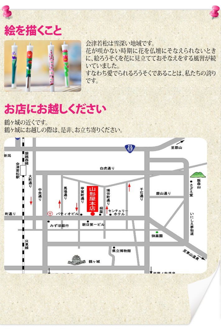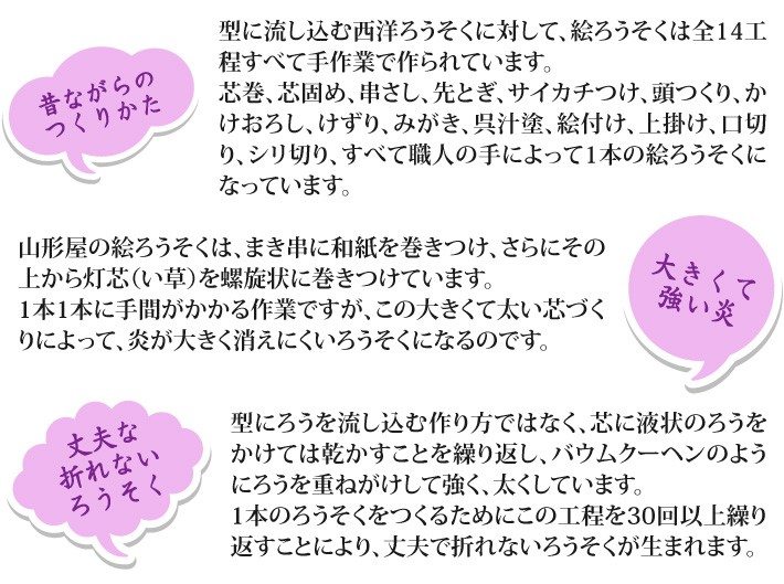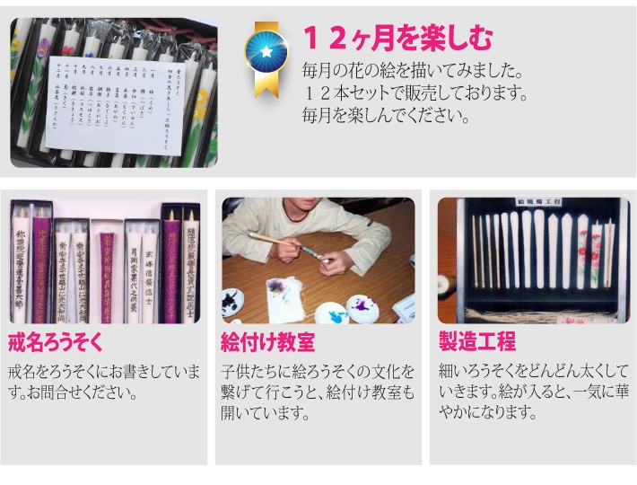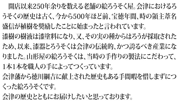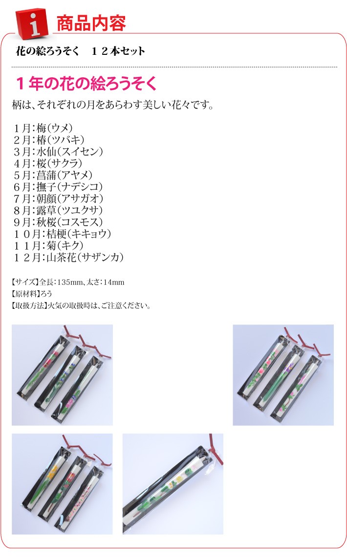 送料無料(ラッピング・送料込みで企画されたギフト商品)でお届けします。会津若松の山形屋本店がお届けする、会津の伝統工芸品 絵ろうそくです。それぞれの月をあらわす美しい花々をセットにしました。【生産者】山形屋本店(福島県会津若松市)【セット内容】花の絵ろうそく 12本セット【サイズ】全長:135mm、太さ:14mm【原材料】ろう【ラッピング】化粧箱・熨斗【発送時期】ご注文後、約3日~7日(常温配送)【取扱方法】火気の取扱時は、ご注意ください。【贈り物】誕生日プレゼント/還暦祝い/お礼/お祝い/内祝い
