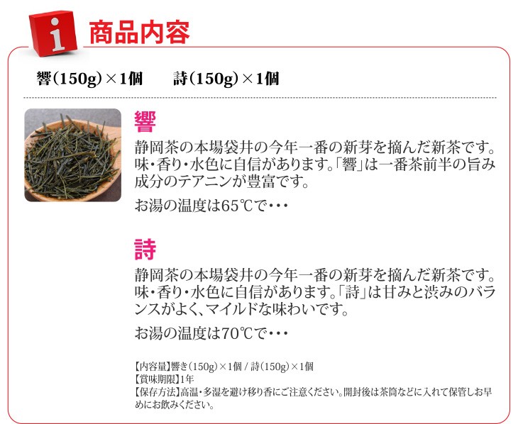※本商品は4月末から5月中旬で新茶に切り替わります。新茶になってからお届けします。送料無料(ラッピング・送料込みで企画されたギフト商品)でお届けします。静岡茶の本場袋井の煎茶です。味・香り・水色に自信があります。「響」は一番茶前半の旨み成分のテアニンが豊富です。「詩」は甘みと渋みのバランスがよく、マイルドな味わいです。印傳の模様の缶が贈る方の真心を伝えます。不織布風呂敷に包んでお届けします。(ピンクかグリーンの色を選択できます)【生産者】にしたな株式会社・茶業部(静岡県袋井市)【内容量】響(150g)/詩(150g)【原材料】緑茶【ラッピング】化粧箱・風呂敷・熨斗【発送時期】ご注文後、約2日~3日(常温配送)【賞味期限】1年【保存方法】高温・多湿を避け移り香にご注意ください。開封後は茶筒などに入れて保管しお早めにお飲みください。【贈り物】誕生日プレゼント/還暦祝い/お礼/お祝い/内祝い/お見舞い品/志