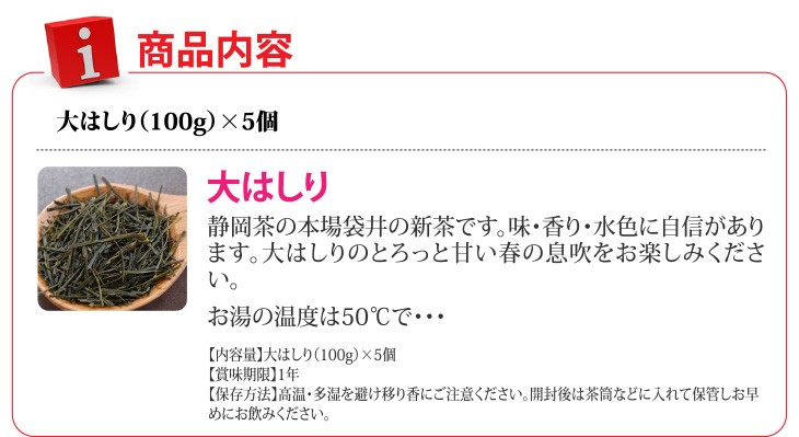 ※本商品は4月末から5月中旬で新茶に切り替わります。新茶になってからお届けします。送料無料(ラッピング・送料込みで企画されたギフト商品)でお届けします。静岡茶の本場袋井の今年一番の新芽を摘んだ煎茶です。味・香り・水色に自信があります。大はしりのとろっと甘い春の息吹をお楽しみください。気軽に贈れる平袋入りです。不織布風呂敷に包んでお届けします。(ピンクかグリーンの色を選択できます)【生産者】にしたな株式会社・茶業部(静岡県袋井市)【内容量】大はしり(100g)×5【原材料】緑茶【ラッピング】化粧箱・風呂敷・熨斗【発送時期】ご注文後、約2日~3日(常温配送)【賞味期限】1年【保存方法】高温・多湿を避け移り香にご注意ください。開封後は茶筒などに入れて保管しお早めにお飲みください。【贈り物】誕生日プレゼント/還暦祝い/お礼/お祝い/内祝い/お見舞い品/志