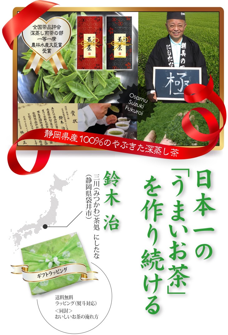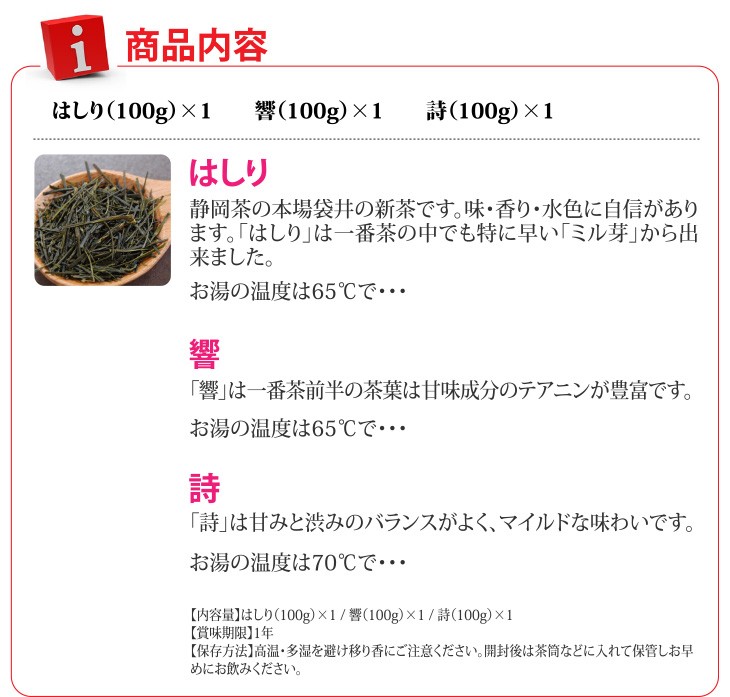 ※本商品は4月末から5月中旬で新茶に切り替わります。新茶になってからお届けします。送料無料(ラッピング・送料込みで企画されたギフト商品)でお届けします。静岡茶の本場袋井の煎茶です。味・香り・水色に自信があります。「はしり」は一番茶の中でも特に早い「ミル芽」から出来ました。「響」は一番茶前半の茶葉は甘味成分のテアニンが豊富です。「詩」は甘みと渋みのバランスがよく、マイルドな味わいです。気軽に贈れる平袋入りです。不織布風呂敷に包んでお届けします。(ピンクかグリーンの色を選択できます)【生産者】にしたな株式会社・茶業部(静岡県袋井市)【内容量】はしり(100g)×1/響(100g)×1/詩(100g)×1【原材料】緑茶【ラッピング】化粧箱・風呂敷・熨斗【発送時期】ご注文後、約2日~3日(常温配送)【賞味期限】1年【保存方法】高温・多湿を避け移り香にご注意ください。開封後は茶筒などに入れて保管しお早めにお飲みください。【贈り物】誕生日プレゼント/還暦祝い/お礼/お祝い/内祝い/お見舞い品/志