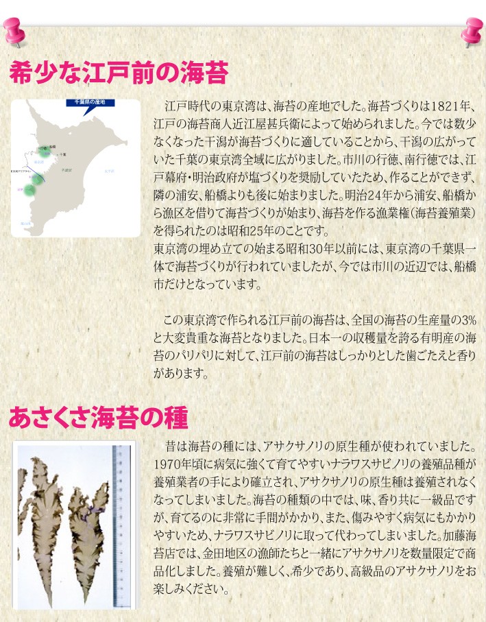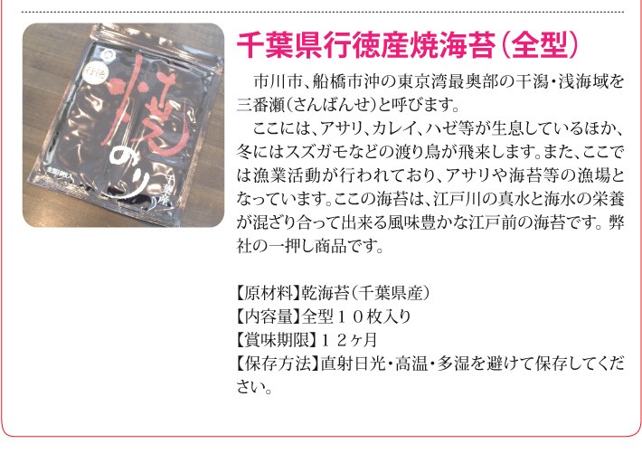送料無料(ラッピング・送料込みで企画されたギフト商品)でお届けします。行徳で3代にわたって続く 江戸前海苔の老舗 加藤海苔店の千葉県産の焼き海苔2種を楽しめるセットです。たっぷりのセットですから、近所へのおすそ分けにも利用いただけます。あさくさ海苔は金田地区の漁師たちと一緒に復活させた数量限定の海苔です。もう一つは、市川市、船橋市沖の東京湾最奥部の干潟・浅海域を三番瀬でとれた風味豊かな江戸前の海苔です。【生産者】加藤海苔店(千葉県市川市)【セット内容】復活のあさくさ海苔の焼海苔×2、千葉県行徳産焼海苔×3【ラッピング】ラッピング・箱・熨斗【発送時期】ご注文後、約1日~5日(常温配送)【賞味期限】開封後15日間【保存方法】開封後は封をしっかり締めて保管し、お早目にお召し上がり下さい。【贈り物】誕生日プレゼント/還暦祝い/お礼/お祝い/内祝い/お見舞い品/志