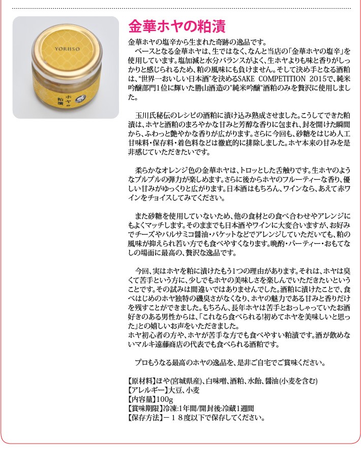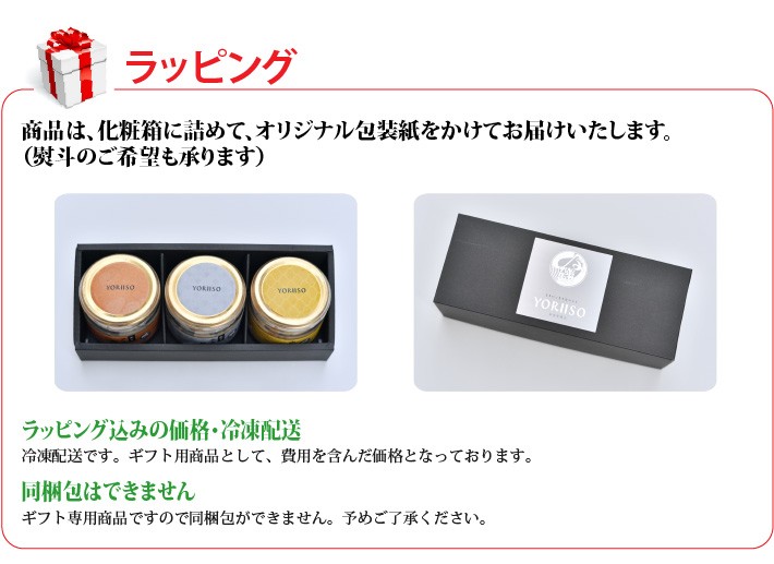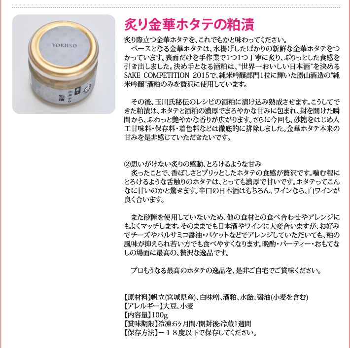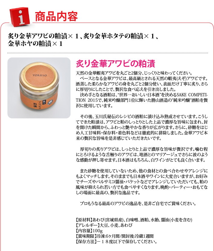 送料無料(ラッピング・送料込みで企画されたギフト商品)でお届けします。石巻のマルキ遠藤株式会社が極限まで素材と味にこだわって作ったYORIISOの贅沢シリーズです。仙台伊達家御用蔵「勝山酒造」の"純米吟醸酒粕"を使用した、至極の粕漬セットです。監修は仙台の日本料理店 "歡の季"の玉川勝義氏に行っていただきました。 「寄磯浜の海産物を、よりいっそう美味しく食べてほしい。」そんな想いから、マルキ遠藤株式会社と、数々の日本酒のプロデュースを手がける仙台の名店"歡の季"の玉川勝義氏が共同で開発いたしました。厳選した素材と徹底した味へのこだわりで、プロもうなる究極の逸品が出来上がりました。【生産者】マルキ遠藤株式会社(宮城県石巻市)【セット内容】炙り金華アワビの粕漬×1、炙り金華ホタテの粕漬×1、金華ホヤの粕漬×1【ラッピング】ギフト箱・熨斗【発送時期】ご注文後、約1日~5日(冷凍配送)【賞味期限】冷凍で1年間、解凍後は冷蔵で1週間【保存方法】冷凍庫に保管してください。【贈り物】誕生日プレゼント/還暦祝い/お礼/お祝い