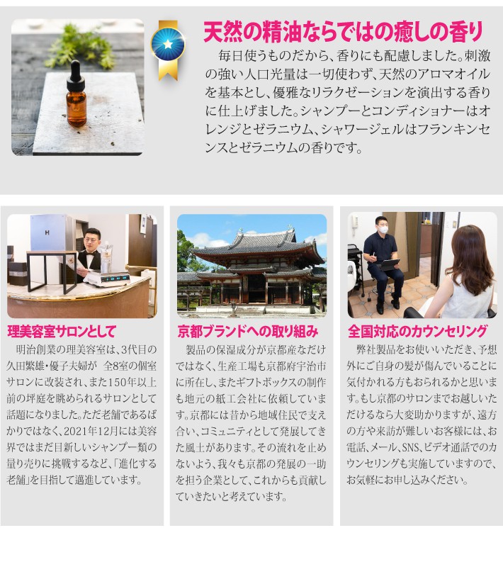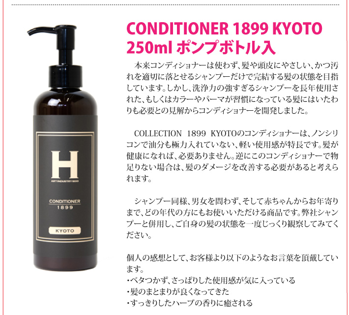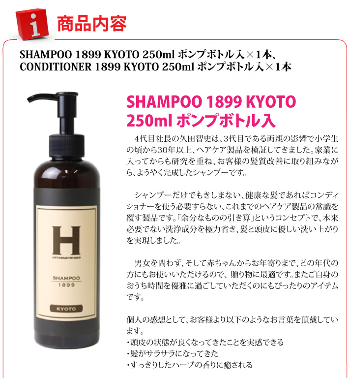 送料無料(ラッピング・送料込みで企画されたギフト商品)でお届けします。京都で創業120年のサロン「ひさだアートインダストリー」がお客様の声と長年の智恵で作り出したシャンプーとコンディショナーの2本セット。洗浄成分の刺激によって髪と頭皮が傷むことをできる限り抑え、極力やさしくなるように成分を構成しました。保湿成分には京都産シルクエキスと京都の酒造より仕入れた酒粕エキスを使用しています。また世界で信頼されている有機認証「エコサート認証」のオーガニックエキスを7種配合しました。さらに天然精油から抽出した癒しの香りをお楽しみください。【生産者】ひさだアートインダストリー(京都府京都市)【内容量】SHAMPOO 1899 KYOTO 250ml ポンプボトル入×1本、CONDITIONER 1899 KYOTO 250ml ポンプボトル入×1本【ラッピング】包装紙、熨斗【発送時期】ご注文後、約3日~7日(常温配送)【使用上の注意】肌に異常があった場合は、ご使用をお控えください。【贈り物】誕生日プレゼント/記念日/お中元/お歳暮/母の日/父の日/敬老の日/バレンタインデー/ホワイトデー/クリスマス/出産祝/長寿お祝/結婚祝/内祝/お返し/サプライズギフト