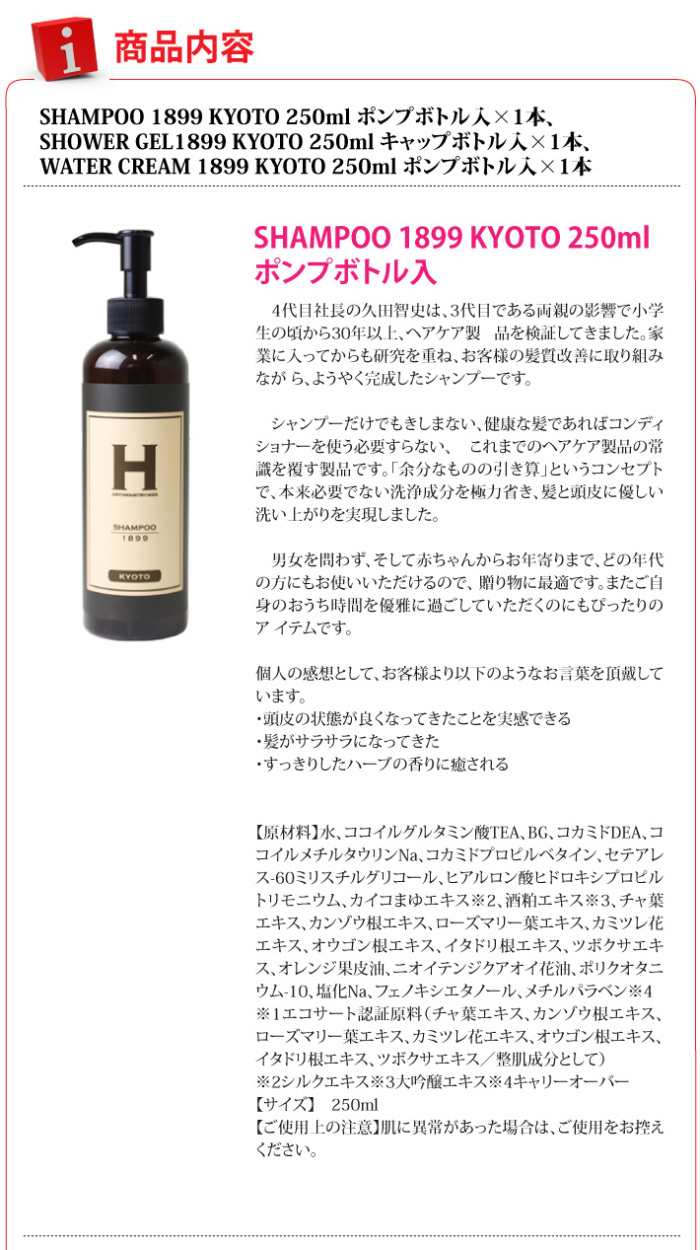 送料無料(ラッピング・送料込みで企画されたギフト商品)でお届けします。クラシックで重厚感のあるオリジナルギフトボックスをご用意しました。シャンプー、シャワージェル、ウォータークリームの豪華な3本セットは、「余計なものの引き算」という概念で開発されたシリーズです。お誕生日や記念日の贈り物など、日頃の感謝を送られる際にぜひお役立てください。【生産者】ひさだアートインダストリー(京都府京都市)【内容量】SHAMPOO 1899 KYOTO 250ml ポンプボトル入×1本、SHOWER GEL1899 KYOTO 250ml キャップボトル入×1本、WATER CREAM 1899 KYOTO 250ml ポンプボトル入×1本【ラッピング】包装紙、熨斗【発送時期】ご注文後、約3日~7日(常温配送)【使用上の注意】肌に異常があった場合は、ご使用をお控えください。【贈り物】誕生日プレゼント/記念日/お中元/お歳暮/母の日/父の日/敬老の日/バレンタインデー/ホワイトデー/クリスマス/出産祝/新築、引っ越し祝/快気祝/長寿お祝/結婚祝/内祝/お返し/サプライズギフト