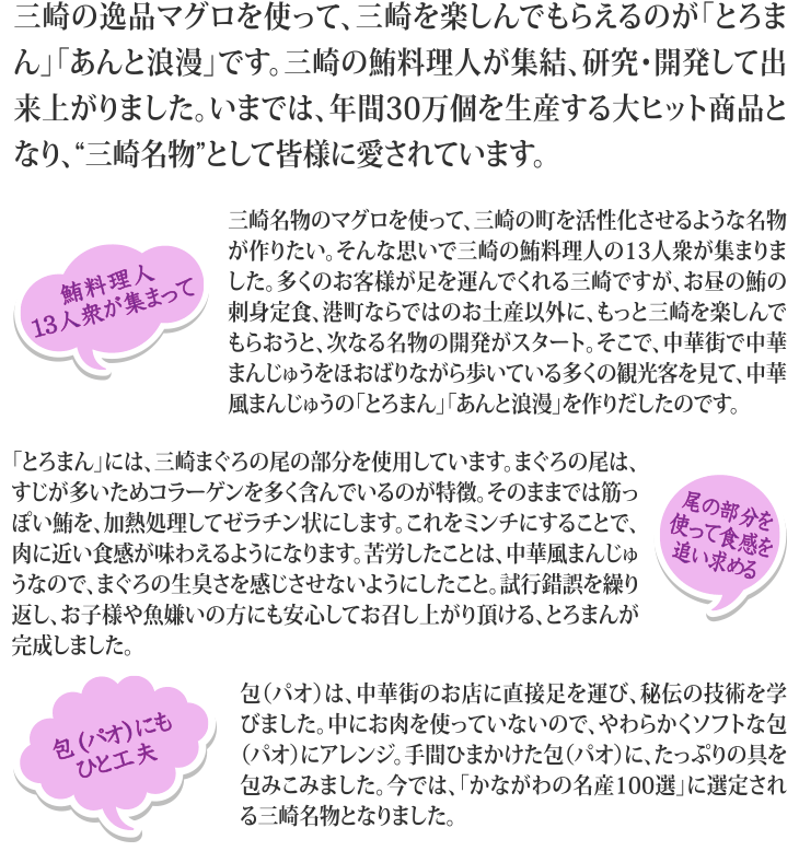 送料無料(ラッピング・送料込みで企画されたギフト商品)でお届けします。三崎港に水揚げされた新鮮なマグロと、三浦の特産のキャベツ、タマネギ、しいたけとをオリジナルのタレに一晩漬け込んだあと蒸しあげました。お肉を使わないヘルシーな中華風まんじゅうです。まぐろの生臭さがなく、お子様や魚嫌いの方にも安心してお召し上がり頂けます。蒸していただくと、お店と変わらない味が楽しめます。また、わさび醤油にもよく合います。ヘルシーなので、朝食からでもどうぞ。【生産者】みさきまぐろ倶楽部(神奈川県三浦市)【内容量】とろまん(110g)5個入り×2袋【ラッピング】化粧箱・包装紙・熨斗(歳暮・中元のみの対応/名入は不可となります)【発送時期】ご注文後、約3日~7日(冷凍配送)【保存方法】冷凍庫にて保存してください。解凍後はお早めにお召し上がりください。【贈り物】誕生日プレゼント/還暦祝い/お礼/お祝い/内祝い/お見舞い品/志