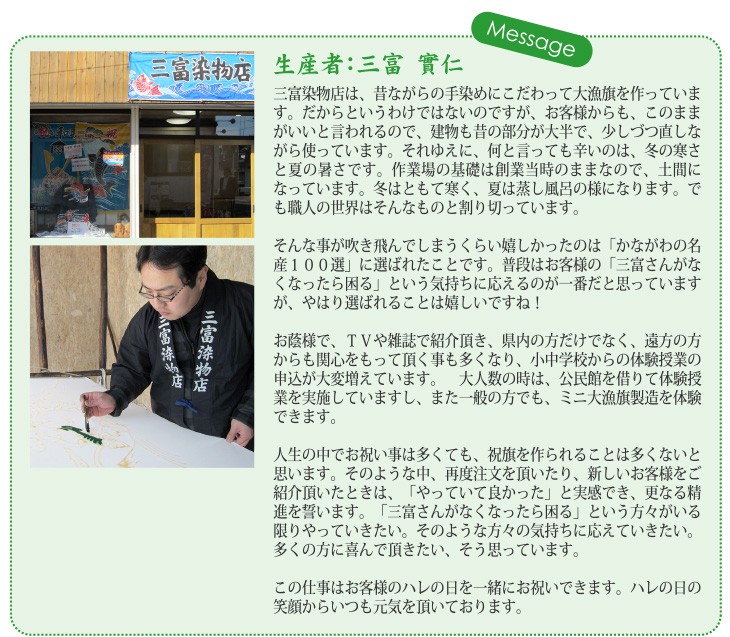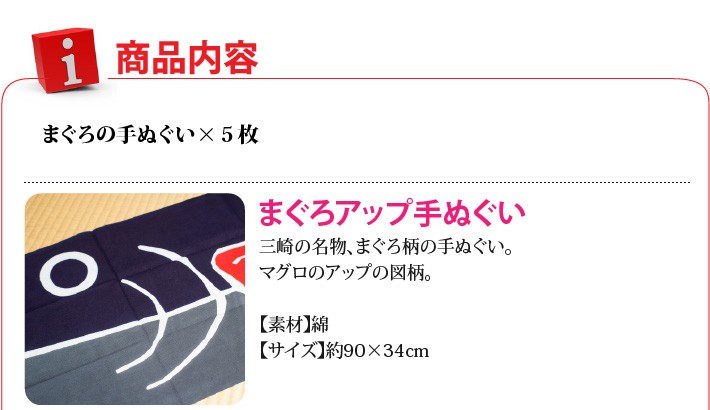 送料無料(ラッピング・送料込みで規格されたギフト商品)でお届けします。三富染物店は、神奈川県に1つだけ残る大漁旗の染物店です。三崎の大漁旗は「かながわの名産100選」にも選ばれています。その大漁旗をモチーフに、マグロの手ぬぐいを作りました。毎年1種類づつ追加して、5本になりました。コレクターとして集めていらっしゃる方もおりますが、実際に使っていただく方も増えています。日本手ぬぐいの良さを知っていただけるのが嬉しいです。今回、おもてなしギフト用に5本セットを用意しました。使って良し、インテリアとして飾って良しの手ぬぐいです。【生産者】三富染物店(神奈川県三浦市)【内容量】まぐろの手ぬぐい×5枚【サイズ】約90×34cm【ラッピング】化粧箱・包装紙・熨斗【発送時期】ご注文後、約3~4週間(常温配送)【贈り物】誕生日プレゼント/還暦祝い/お礼/お祝い/内祝