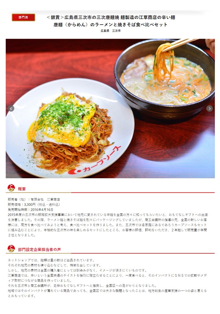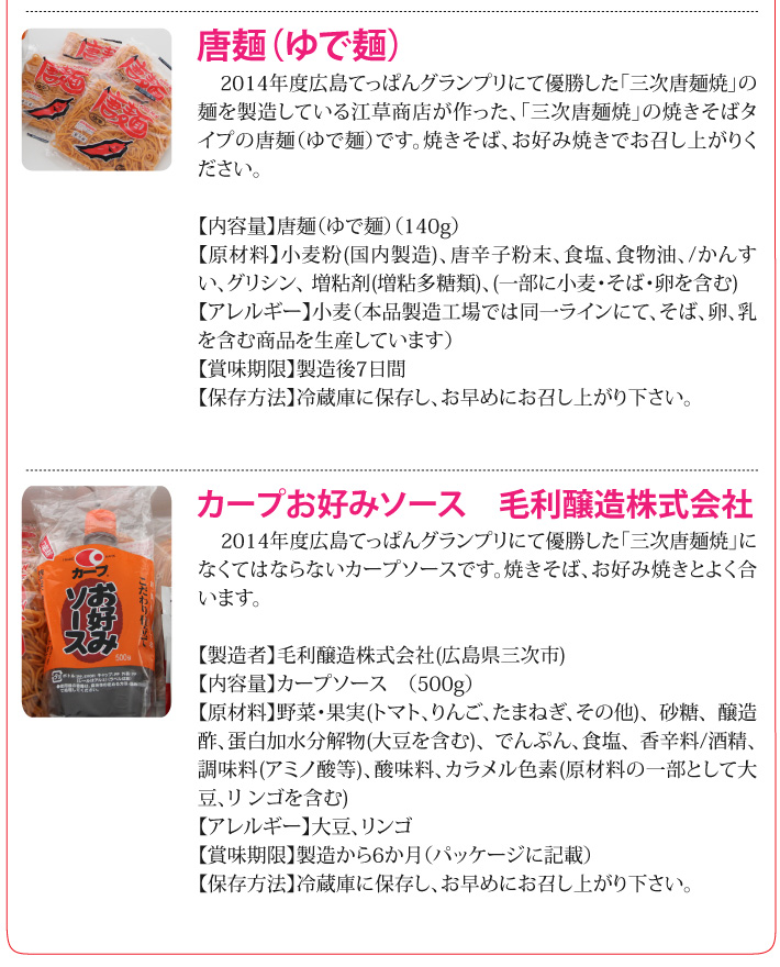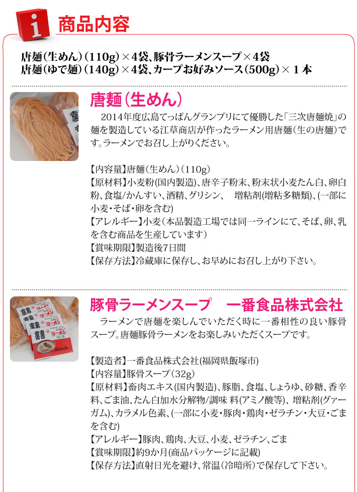 送料無料(ラッピング・送料込みで企画されたギフト商品)でお届けします。唐麺のラーメン4食と焼きそば4食のセット。2014年度広島てっぱんグランプリにて優勝した「三次唐麺焼」の麺を製造している江草商店が作ったラーメン用唐麺と焼きそば用唐麺です。ラーメンには一番相性の良い豚骨スープをセットにしました。焼きそばにはもちろんカープソースをセットにしました。辛さに挑戦してください。辛いもの好きのあの方のプレゼントに、是非、どうそ。【生産者】江草商店(広島県三次市)【内容量】唐麺(生めん)(110g)×4袋、豚骨ラーメンスープ×4袋、唐麺(ゆで麺)(140g)×4袋、カープお好みソース(500g)×1本【ラッピング】化粧箱・包紙・熨斗【発送時期】ご注文後、約3日~7日(冷蔵配送)【賞味期限】製造後7日間【保存方法】冷蔵庫に保存し、お早めにお召し上がり下さい。【贈り物】誕生日プレゼント/還暦祝い/お礼/お祝い/内祝い/お見舞い品