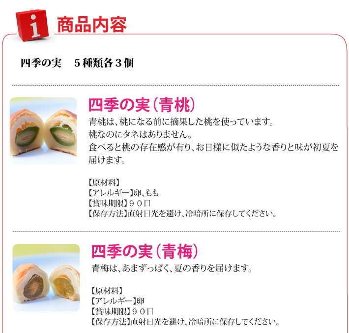 送料無料(ラッピング・送料込みで企画されたギフト商品)でお届けします。広島県三次市の季節を包み込んだ優しい和菓子です。四季の実は地元の卵の黄味がたっぷり入った黄味あんに寒梅粉を入れ熟成味醂でのばし青桃、青梅、杏子、栗、金柑を丸ごと包み焼き上げた一品で口どけ良く各フルーツからあんに出た蜜の味が季節を思い出させるお菓子です。季節を思いださせる一粒をちょっとしたお使い物に是非、どうぞ。【生産者】和洋菓子工房 泉屋(広島県産三次市 名物商品)【内容量】四季の実 5種類各3個【ラッピング】化粧箱・包装紙・熨斗【発送時期】注文後、5日~1週間以内(常温配送)【賞味期限】90日【保存方法】常温【贈り物】誕生日プレゼント/還暦祝い/お礼/お祝い/内祝い/お見舞い品/志