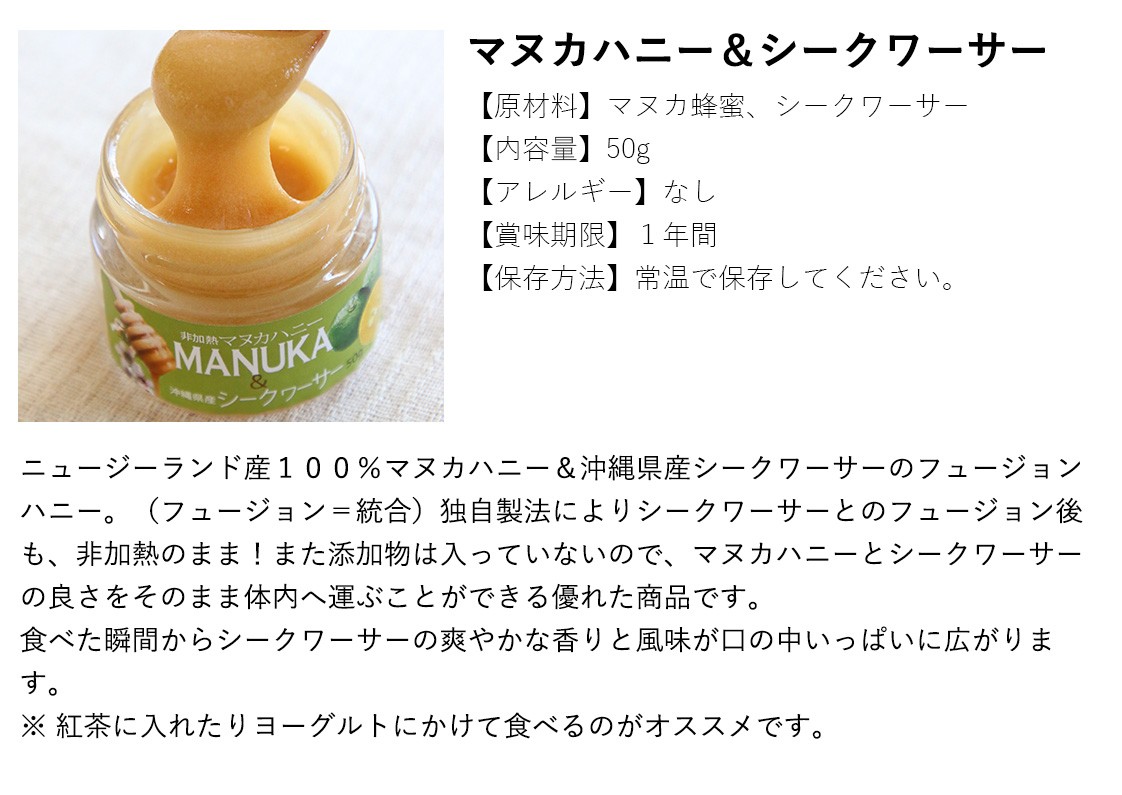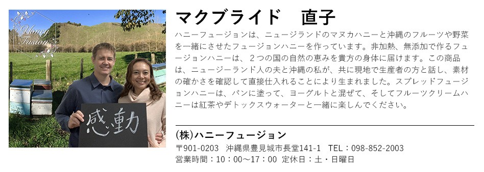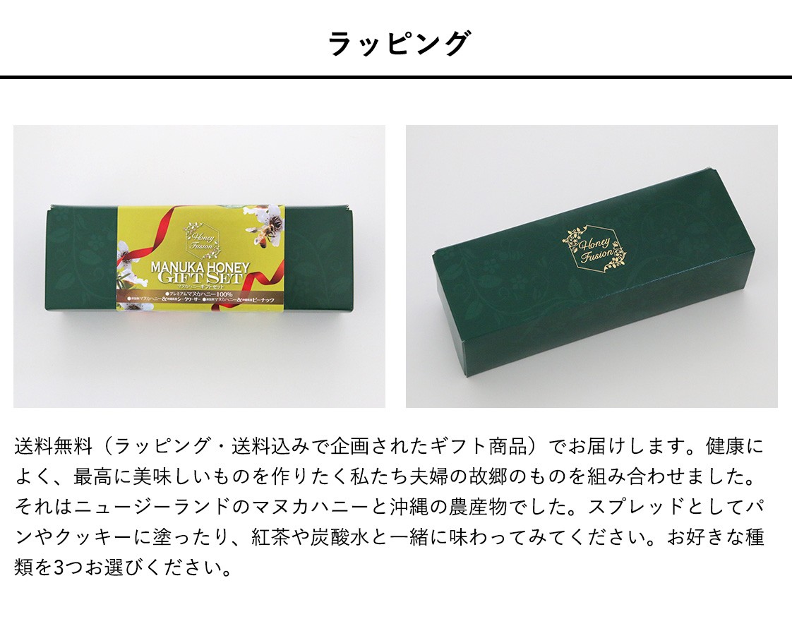 送料無料(ラッピング・送料込みで企画されたギフト商品)でお届けします。健康によく、最高に美味しいものを作りたく私たち夫婦の故郷のものを組み合わせました。それはニュージーランドのマヌカハニーと沖縄の農産物でした。スプレッドとしてパンに塗ったり、ヨーグルトに混ぜたり、紅茶や炭酸水と一緒に味わってみてください。お好きな種類を3つお選びください。【生産者】ハニーフュージョン(沖縄県豊見城市)【セット内容】スプレッドハニー 3個お選びください【ラッピング】リボン、ギフト箱・熨斗【発送時期】ご注文後、約1日~5日(常温配送)【賞味期限】1年間【保存方法】常温で保管してください。【贈り物】誕生日プレゼント/還暦祝い/お礼/お祝い