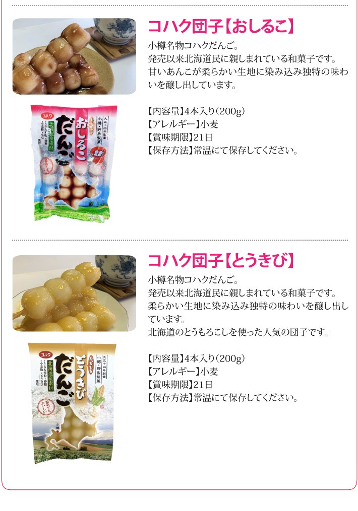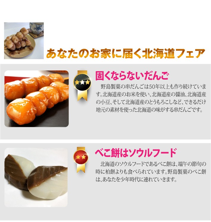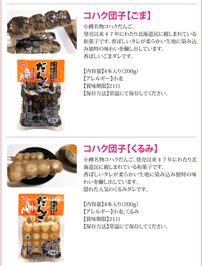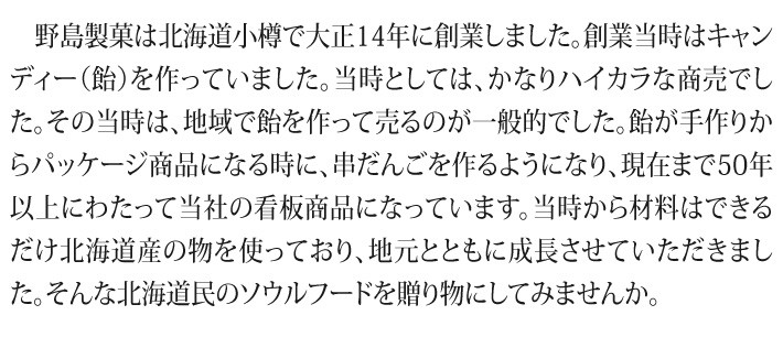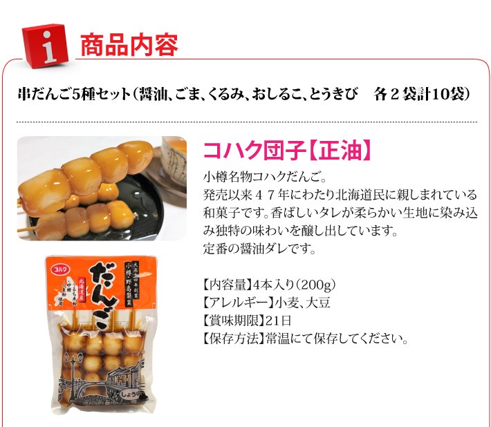 送料無料でお届けします。小樽名物コハクだんご。発売以来47年にわたり北海道民に親しまれている和菓子です。香ばしいタレが柔らかい生地に染み込み独特の味わいを醸し出しています【生産者】野島製菓(北海道産 小樽市)【セット内容】串だんご5種セット(醤油、ごま、くるみ、おしるこ、とうきび 各2袋計10袋)【ラッピング】なし。配送用段ボールになります。【発送時期】ご注文後、約1日~5日(常温配送)【賞味期限】21日【保存方法】常温で保管してください。【贈り物】誕生日プレゼント/還暦祝い/お礼/お祝い/内祝い
