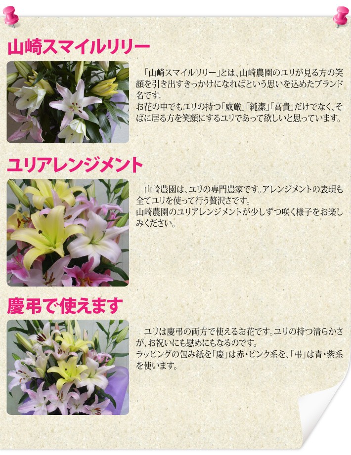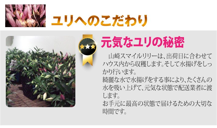 送料無料(ラッピング・送料込みで企画されたギフト商品)でお届けします。千葉県佐倉市で年間約10万本のユリを育ています。西洋では「celebration(祝賀)」の花言葉で愛されているユリはお祝いに最適です。おもてなしギフトには、「山崎スマイルリリー」として厳選したユリをお届けしています。受け取った方の笑顔を引き出すユリである様にと願っています。 当農園では、つぼみが膨らみ色がのった状態のユリを出荷しています。季節にもよりますが、届いて1週間ぐらいから順に咲いていくユリを楽しんでいただけます。【販売者】山崎農園(千葉県佐倉市)【生産者】山崎農園【本数・サイズ】2~3本 長さ約80cm【ラッピング】花専用ダンボール箱・熨斗【発送時期】ご注文後、約3日~7日(常温配送)【贈り物】誕生日プレゼント/還暦祝い/お礼/お祝い/内祝い/お見舞い品