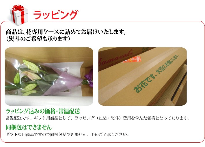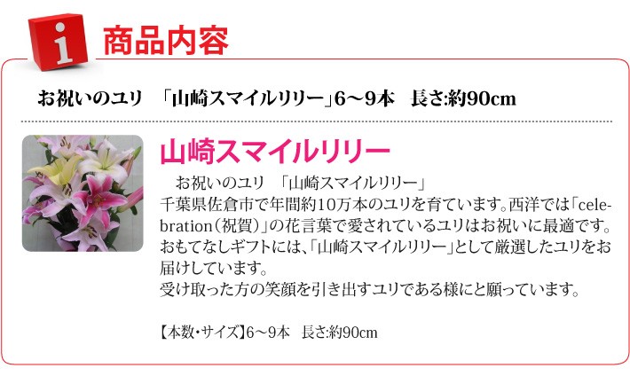 送料無料(ラッピング・送料込みで企画されたギフト商品)でお届けします。千葉県佐倉市で年間約10万本のユリを育ています。西洋では「celebration(祝賀)」の花言葉で愛されているユリはお祝いに最適です。おもてなしギフトには、「山崎スマイルリリー」として厳選したユリをお届けしています。受け取った方の笑顔を引き出すユリである様にと願っています。 当農園では、つぼみが膨らみ色がのった状態のユリを出荷しています。季節にもよりますが、届いて1週間ぐらいから順に咲いていくユリを楽しんでいただけます。【販売者】山崎農園(千葉県佐倉市)【生産者】山崎農園【本数・サイズ】6~9本 長さ約90cm【ラッピング】花専用ダンボール箱・熨斗【発送時期】ご注文後、約3日~7日(常温配送)【贈り物】誕生日プレゼント/還暦祝い/お礼/お祝い/内祝い/お見舞い品