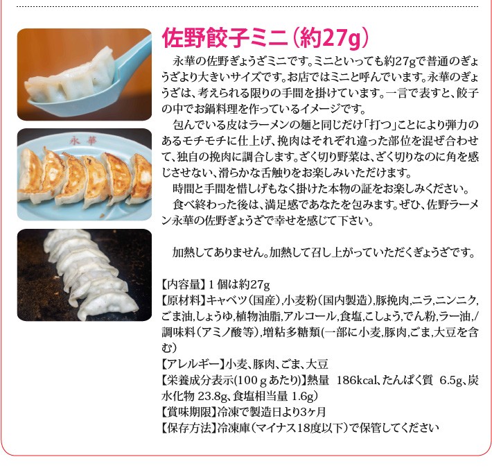 送料無料(ラッピング・送料込みで企画されたギフト商品)でお届けします。佐野ラーメン永華で人気のジャンボ餃子とミニ餃子の2種類の詰め合わせです。ジャンボはなんと約70g、永華のミニは約27gもあります。うまい!大きい!餃子を楽しんでください。ジャンボ餃子は、プレゼントに使われる方が多いため、贈答用に二重包装しています。このジャンボさで驚かせてください。この大きさゆえ、機械で作ることができません。一つひとつ手で包んでいます。そのため製造できる量が限られるため、繁忙期には売り切れとなることがあります。ご容赦ください。【生産者】佐野ラーメン永華(栃木県佐野市)【セット内容】ジャンボ餃子10個入り(お店では2人前)×2パック、ミニ餃子24個入り(お店では4人前)×2袋【ラッピング】専用箱・熨斗(短冊)対応、包装紙対応、二重包装対応【発送時期】ご注文後、約1日~3日営業日(冷凍配送)【賞味期限】冷凍で製造日より3ヶ月【保存方法】冷凍庫(マイナス18度以下)で保管してください【贈り物】プレゼント/父の日/母の日/敬老の日/お礼/お祝い/お返し/プチギフト