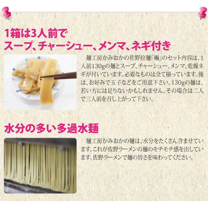 送料無料(ラッピング・送料込みで企画されたギフト商品)でお届けします。佐野の老舗麺工房 かみおかが作った佐野拉麺「極」。極みの名前をつけるプライドで作る佐野サーメンを、ぜひ、食べてみてください。3食入り12箱の6食セットです。1玉は130gですので、1.5人前でも食べれます。 ご近所にもたっぷりおすそ分け出来るセットを作りました。【生産者】麺工房かみおか(栃木県佐野市)【セット内容】佐野拉麺「極」(3食入り)×12箱(チャーシュー、メンマ、乾燥ネギ付き)【ラッピング】専用箱・熨斗【発送時期】ご注文後、約1日~2日(常温配送)【賞味期限】2週間【保存方法】常温で保管してください【贈り物】誕生日プレゼント/上司へのプレゼント/父の日/母の日/敬老の日/お礼/お祝い/内祝い/お返し