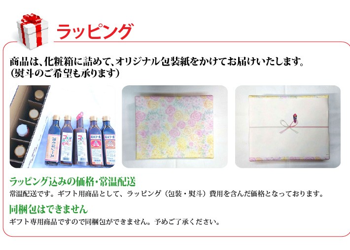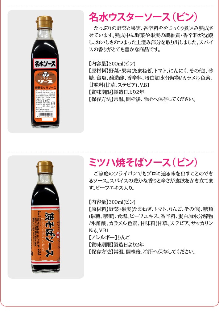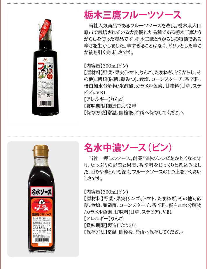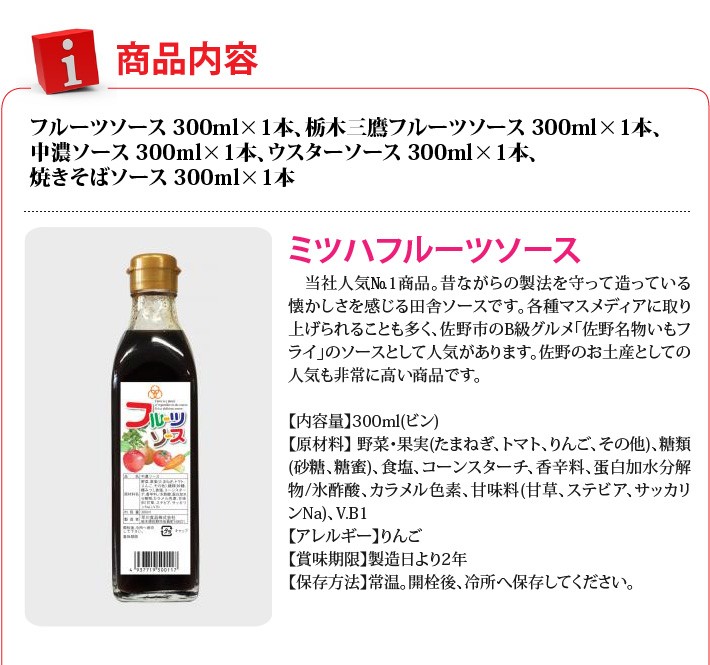 送料無料(ラッピング・送料込みで企画されたギフト商品)でお届けします。佐野名物いもフライの会を立ち上げた老舗ソース屋のミツハソースの名水ソース、フルーツソース、そして焼きそばソースの詰め合わせです。このソースをブレンドして、自分のオリジナルソース作りにチャレンジできるギフトセットです。ソース好きの方に贈ってみませんか。【生産者】ミツハソース(早川食品)(栃木県佐野市)【セット内容】フルーツソース 300ml×1本、栃木三鷹フルーツソース 300ml×1本、中濃ソース 300ml×1本、ウスターソース 300ml×1本、焼きそばソース 300ml×1本 【発送時期】ご注文後、約1日~2日(常温配送)【賞味期限】製造日より2年【保存方法】常温。開栓後、冷所へ保存してください。【贈り物】誕生日プレゼント/上司へのプレゼント/父の日、母の日、敬老の日/お礼/お祝い/内祝い/お返し