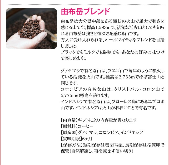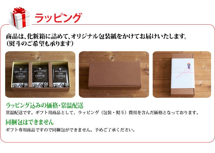 送料無料(ラッピング・送料込みで企画されたギフト商品)でお届けします。マウンテンコーヒーが「山の」イメージでコーヒーをブレンドしました。丸くて可愛い山、雄大に広がる山、険しく猛々しい山の3種類を詰め合わせました。 コーヒー好きの方にコーヒーを贈りたいけど、よくわからないという方に、山のイメージでコーヒーを選んでいただけます。日本の山には古くから信仰や威厳がありました。またコーヒー豆も世界の山地で収穫されています。そんなつながりでブレンドを作りました。ウンチクではなく、イメージでコーヒーを贈ってみませんか。【生産者】マウンテンコーヒー(大阪府高槻市)【セット内容】飯野山ブレンド(150g)×1、由布岳ブレンド(150g)×1、剱岳ブレンド(150g)×1【発送時期】ご注文後、約1日~2日(常温配送)【賞味期限】6ヶ月(豆で1ヶ月、粉で2週間を推奨)【保存方法】短期保存は密閉常温、長期保存は冷凍庫で保管(自然解凍し、再冷凍せず使い切り)【贈り物】誕生日プレゼント/上司へのプレゼント/父の日、母の日、敬老の日/お礼/お祝い/内祝い/お返し