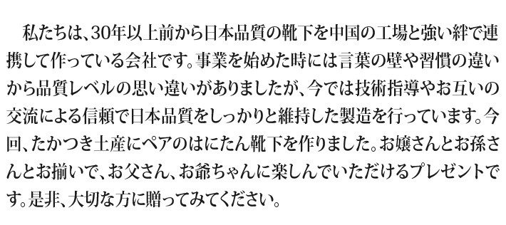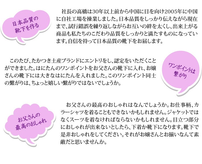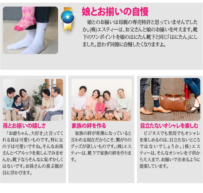 送料無料(ラッピング・送料込みで企画されたギフト商品)でお届けします。大阪府高槻の老舗 (株)エスティーが作ったペア靴下です。お父さんと娘さんで、ぜひペアで履いてほしい靴下です。お子様の喜ぶ顔が目に浮かびます。【生産者】(株)エスティー(大阪府高槻市)【セット内容】大人用×2、子供用×4、ペットボトルカバー×1(ピンクかブルーを選んでください)【発送時期】ご注文後、5~7日(常温配送)【贈り物】誕生日プレゼント/還暦祝い/お礼/お祝い/内祝い/父の日/母の日【返品について】商品の性質上、お客様のご都合による返品は原則としてお受けできません。