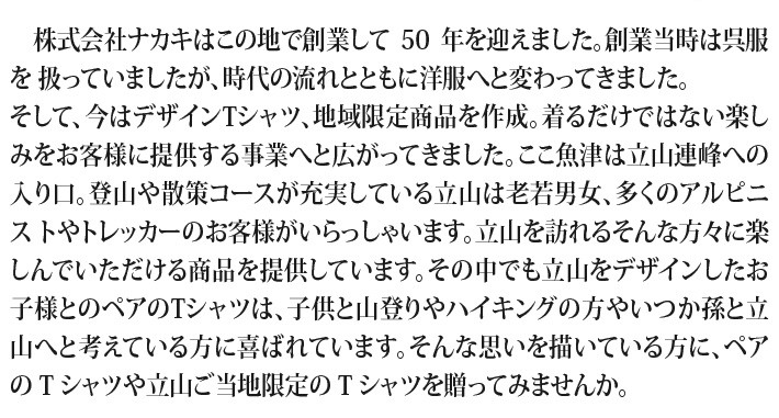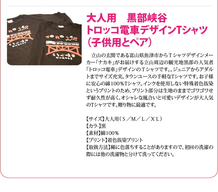 送料無料(ラッピング・送料込みで企画されたギフト商品)でお届けします。立山の玄関である富山県魚津市からTシャツデザインメーカー「ナカキ」がお届けする立山周辺の観光地黒部の人気者「トロッコ電車」デザインのTシャツです。。ジュニアからアダルトまでサイズ充実。タウンユースの手軽なTシャツです。お子様に安心の綿100%Tシャツ。インクを使用しない特殊着色抜染というプリントのため、プリント部分は生地のままでゴワゴワせず オシャレな風合いと可愛いデザインが大人気のTシャツです。【生産者】ナカキ(富山県魚津市)【セット内容】子供用黒部峡谷「トロッコ電車」デザインTシャツ×1枚、大人用黒部峡谷「トロッコ電車デザイン」Tシャツ×1枚【カラー】黒【発送時期】ご注文後1週間~10日(常温配送)【贈り物】誕生日プレゼント/還暦祝い/お礼/お祝い/内祝い【返品について】商品の性質上、お客様のご都合による返品は原則としてお受けできません。