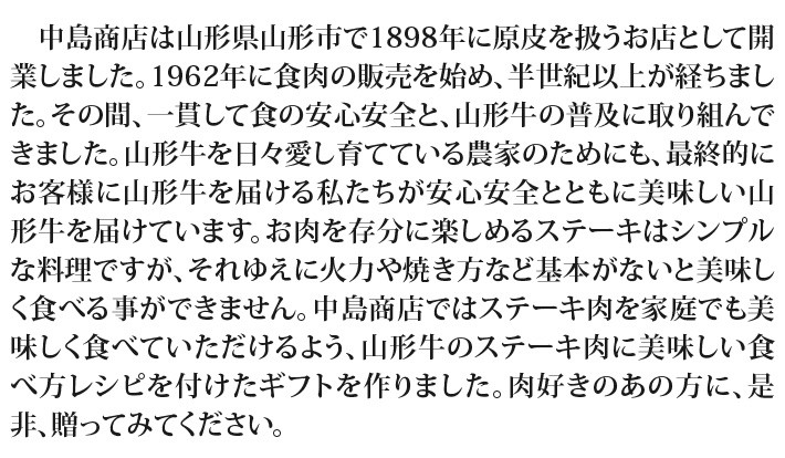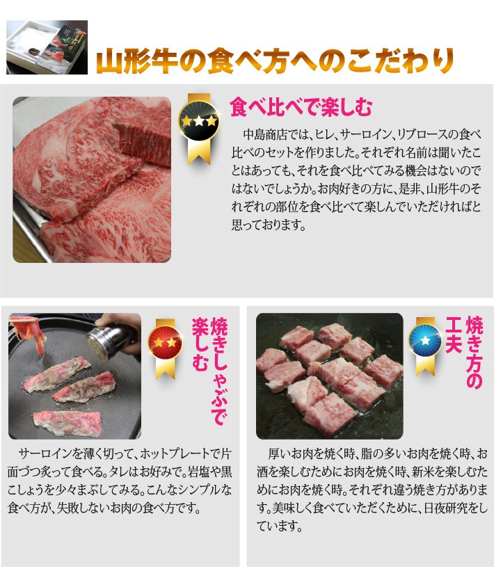 送料無料(ラッピング・送料込みで企画されたギフト商品)でお届けします。100年以上の歴史を持つ山形の老舗 中島商店の山形牛を食べ比べていただくステーキセット ヒレステーキ、サーロインステーキ、リブロースステーキを食べ比べてみてください。【生産者】中島商店(山形県山形市)【セット内容】サーロインステーキ(200g)×1、ヒレステーキ(150g)×1、リブロースステーキ(150g)×1【ラッピング】化粧箱、包装紙、熨斗【発送時期】ご注文後、3~5日(冷蔵配送)【賞味期限】3日間【保存方法】冷蔵庫に保存してください。3日を超えての保存の場合は、冷凍してください。【贈り物】誕生日プレゼント/還暦祝い/お礼/お祝い/内祝い/お見舞い品