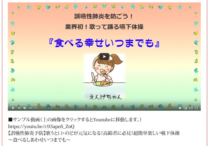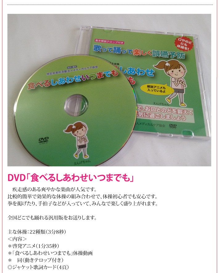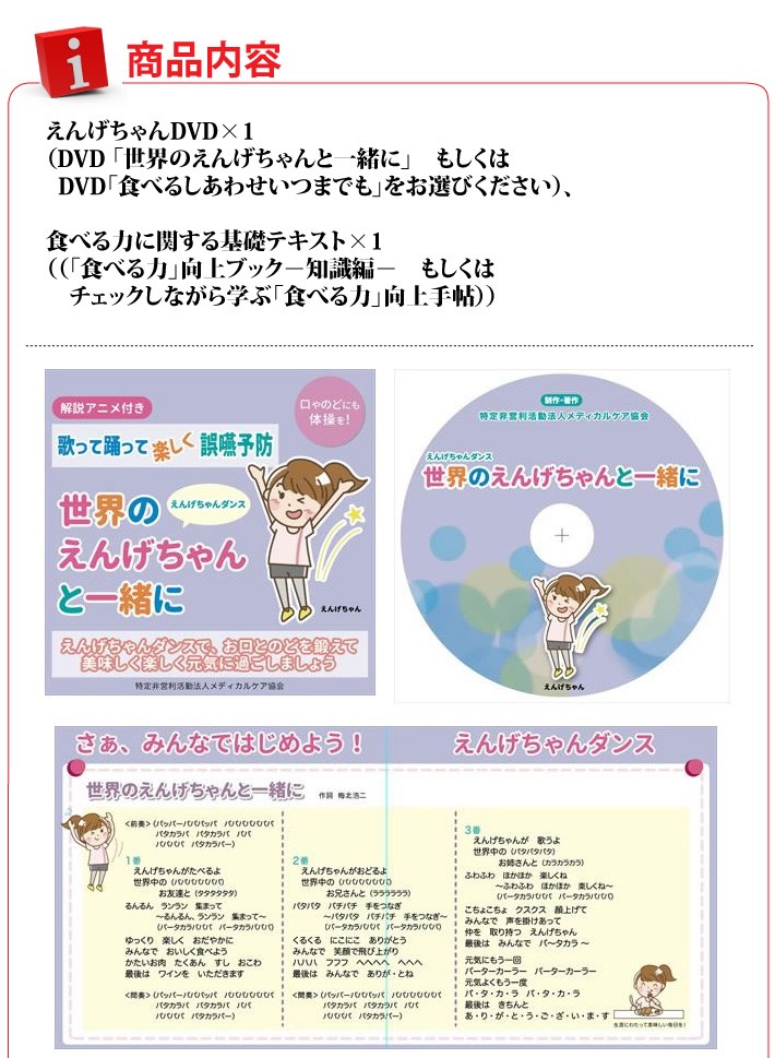 送料無料(ラッピング・送料込みで企画されたギフト商品)でお届けします。Be-HEALTHYが医師、歯科医、大学教授等「食べる機能の専門家と一緒に、人生100年時代に一番重要となる「食べる」を考えて作った、食べる機能の衰え予防のための体操です。 体操動画DVDと嚥下に関するテキストセット。【販売者】Be-HEALTHY Association(東京都江東区)【内容量】えんげちゃんDVD×1(DVD 「世界のえんげちゃんと一緒に」 もしくは DVD「食べるしあわせいつまでも」をお選びください)、食べる力に関する基礎テキスト×1((「食べる力」向上ブック-知識編- もしくは チェックしながら学ぶ「食べる力」向上手帖))【ラッピング】包装紙【発送時期】ご注文後、約5日~7日(常温配送)【使用上の注意】*体操を行う際の注意点をよく読んで、無理せず安全に実施してください。*体操の効果を保証するものではありません。【贈り物】誕生日プレゼント/還暦祝い/お祝い/母の日/父の日/敬老の日